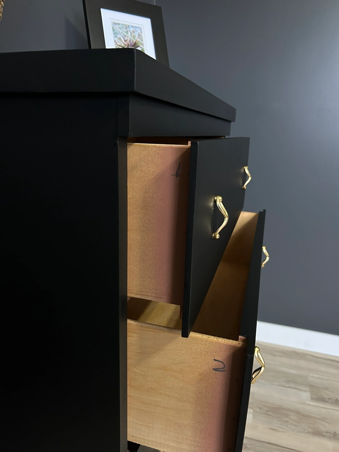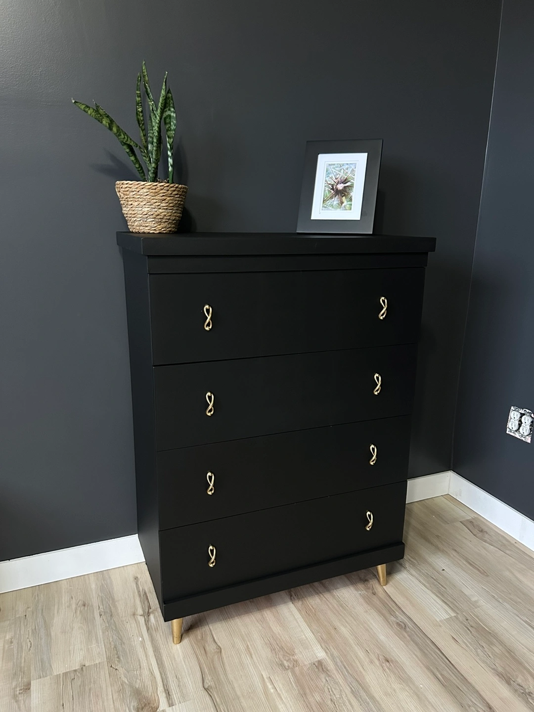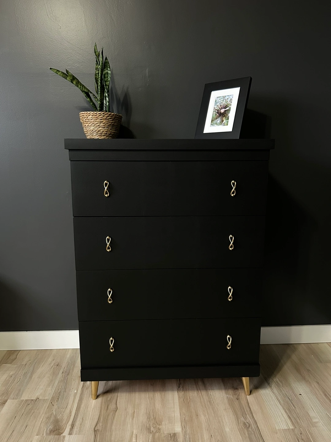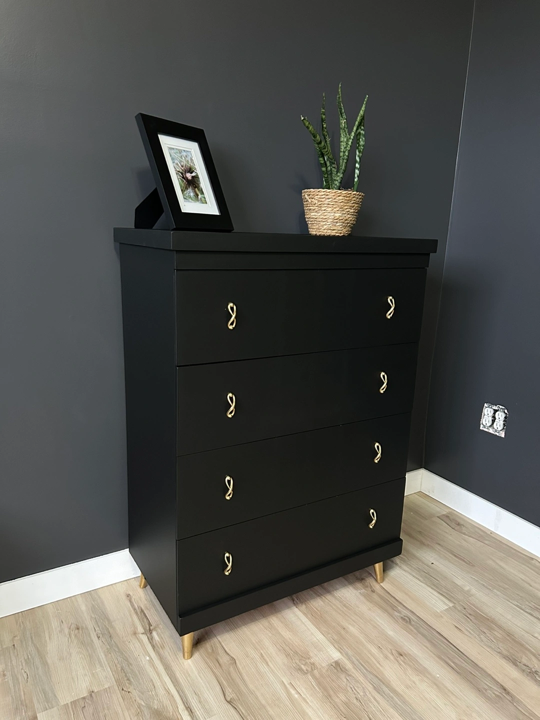 15This 4 drawer solid wood drawer front tall dresser with matte gold legs was just beautifully refinished with a matte black paint, matte gold hardware and matte gold legs to match! Located by Onoway $175 obo 30” across, 43” tall, 16” out.