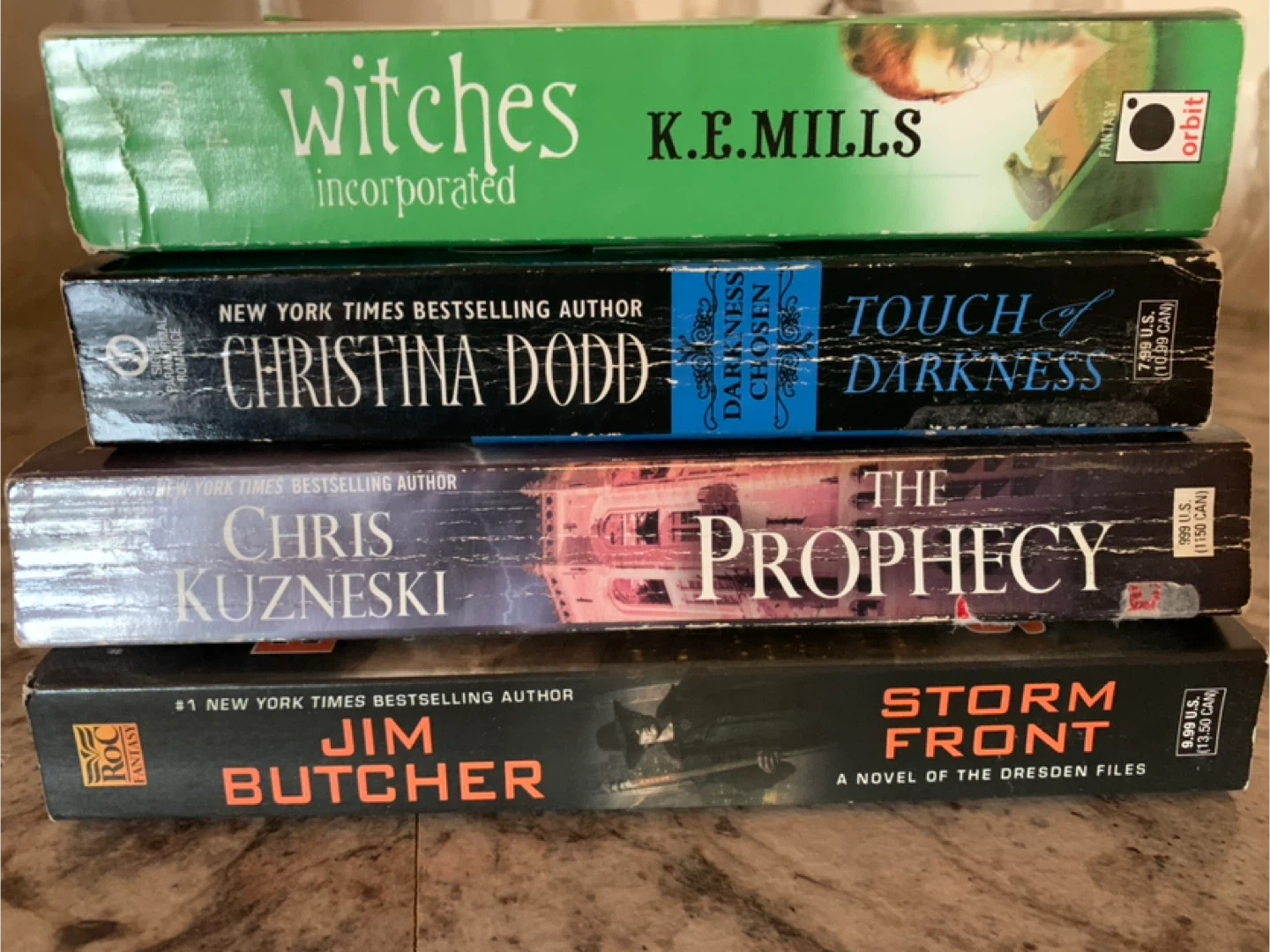 Selling a set of four fantasy novels! Includes: - Witches Incorporated by K.E. Mills - Touch of Darkness by Christina Dodd - The Prophecy by Chris Kuzneski - Storm Front by Jim Butcher