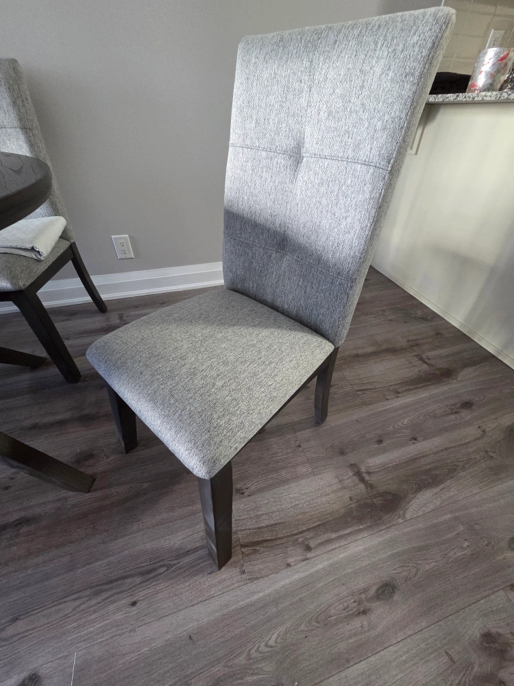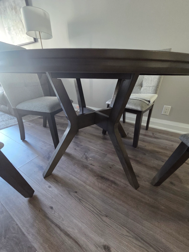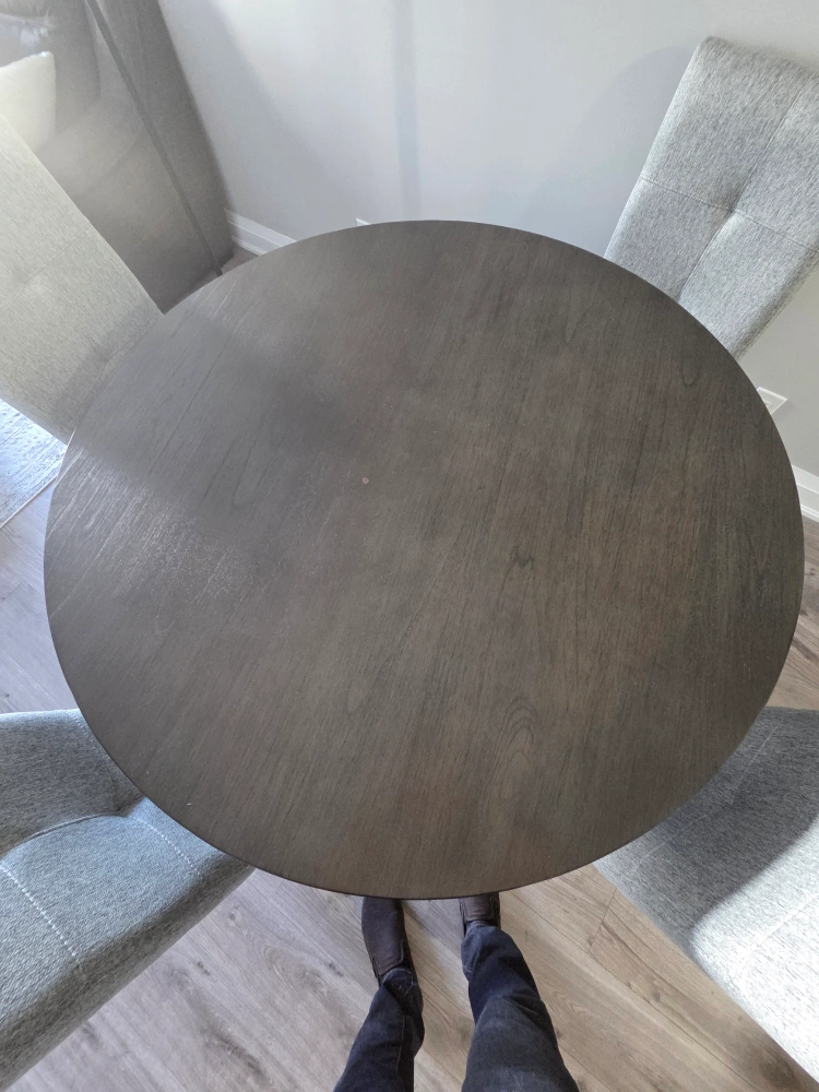 Must sell ,round dining table with four chairs. The table is a grey brown wood colour, and the chairs are upholstered in a light gray fabric. The set is in great condition and would be perfect for a small dining room or kitchen.