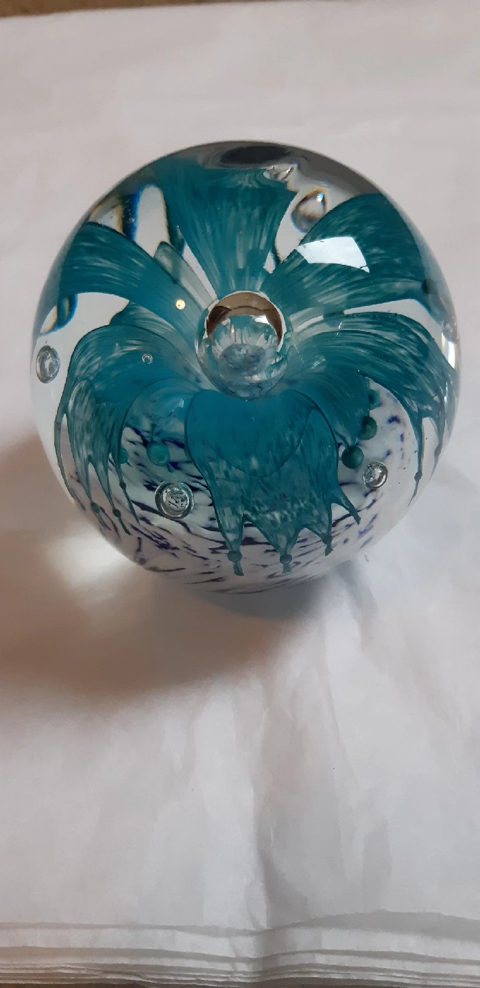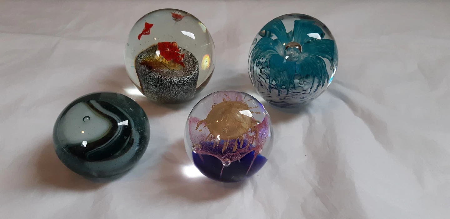 826A beautiful collection of decorative glass paperweights.. perfect for adding a touch of elegance to any desk or shelf. Each one is handmade and features a unique design. They're in great condition and ready to find a new home!