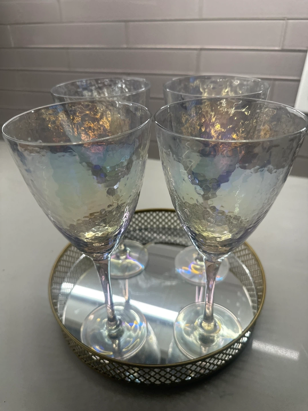 190Selling a set of four beautiful iridescent stemmed martini glasses. They have a lovely hammered texture that catches the light beautifully. Perfect for adding a touch of elegance to your home bar or special occasions