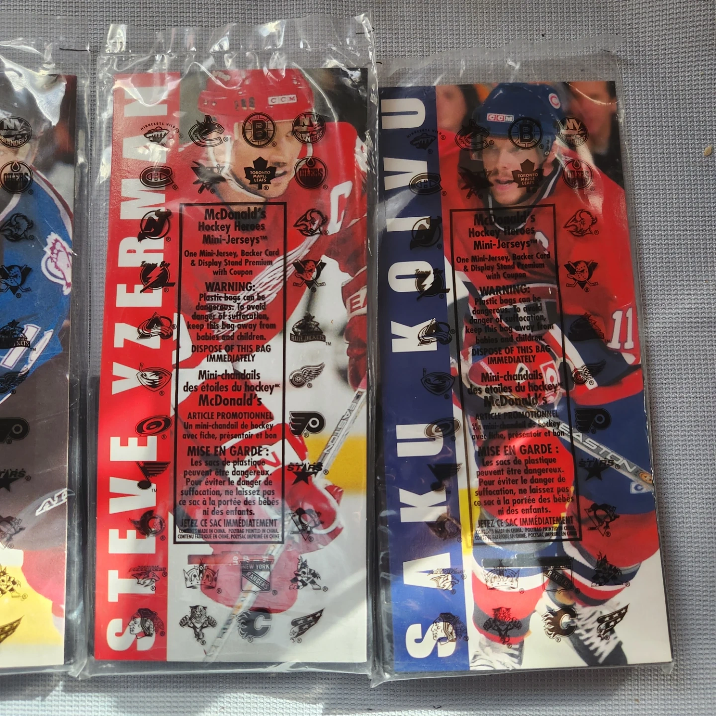 64Selling a collection of McDonald's Hockey Heroes Mini-Jerseys! Each one comes with a mini-jersey, a sticker card, and a display stand premium with coupon. Perfect for any hockey fan or collector