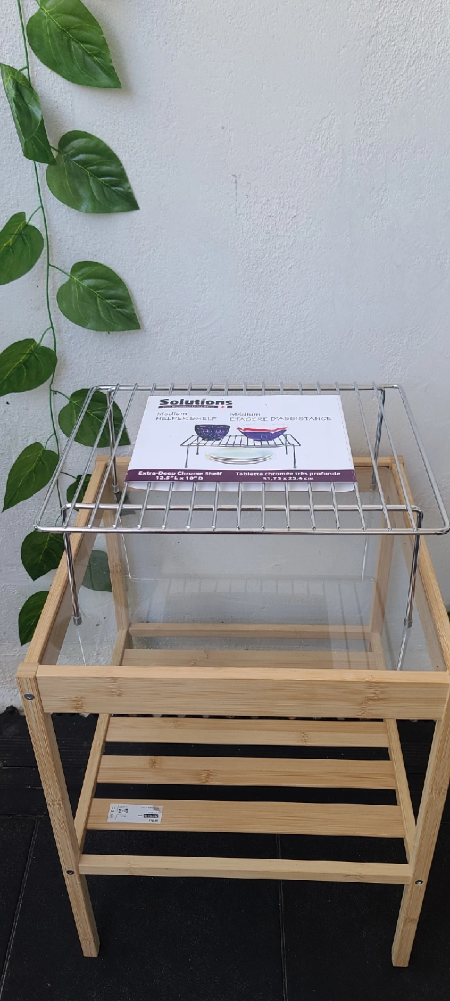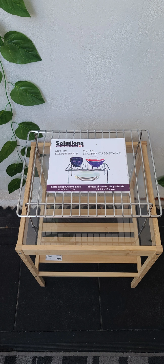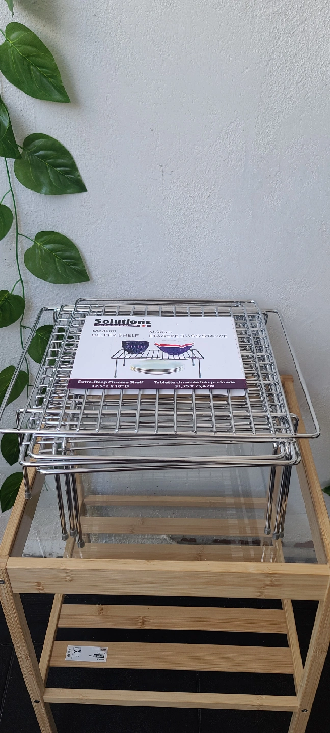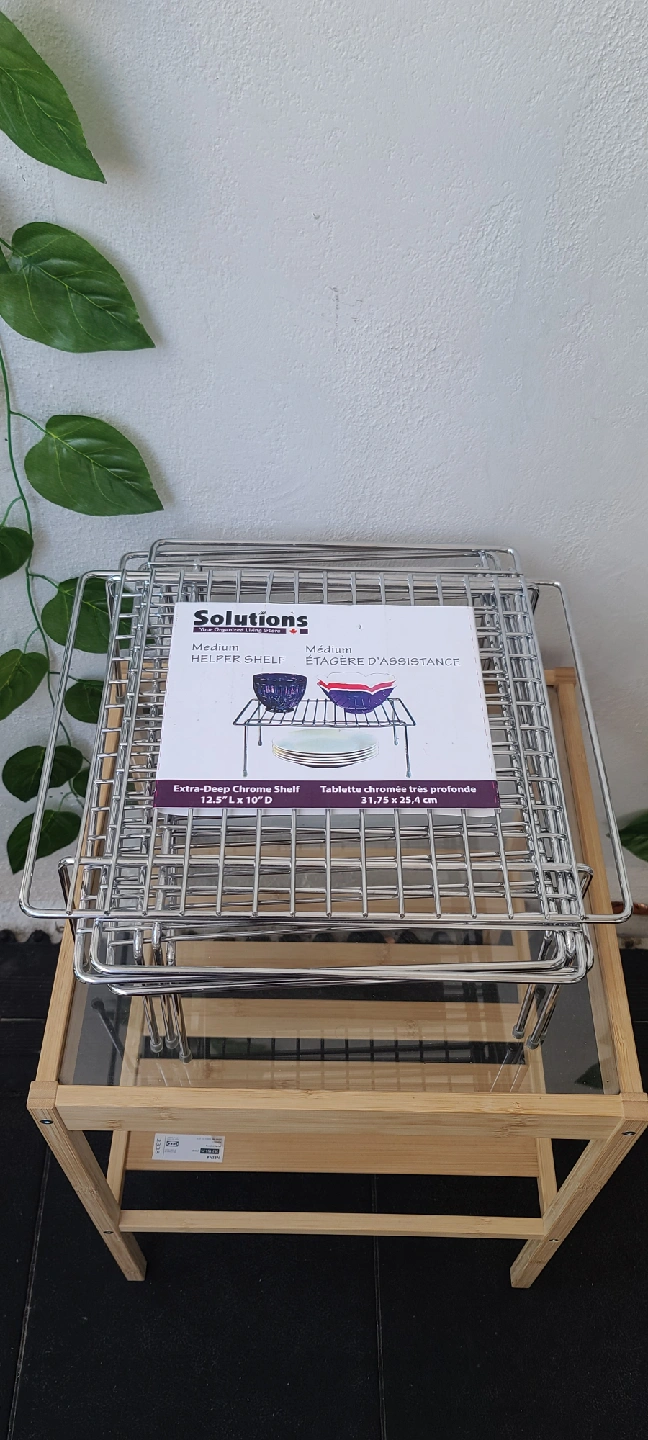 Brand new 4pcs still in the original packaging. This is a "Solutions" brand medium-sized helper shelf, perfect for adding an extra level of storage in your kitchen cabinets, pantry, or even on a countertop. It helps to organize dishes, spices, cans, and more, making use of vertical space. Condition: Brand new, never used. Material: Durable chrome-plated metal. Dimensions: 12.5" x 10" (31.75 cm x 25.4 cm) Purpose: Ideal for kitchen organization, but can also be used in bathrooms, offices, or anywhere you need extra space. From Smoke Free | Pet Free Home 📍Wellesley and Sherbourne