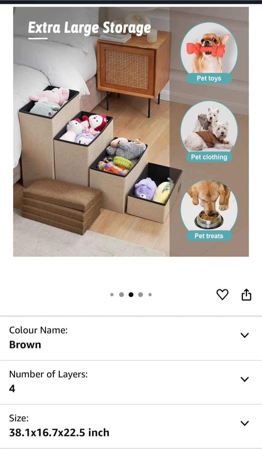 73These brown, 4-step dog stairs are perfect for helping your furry friend reach the bed, sofa, or car! They also have extra large storage inside for pet toys, clothing, or treats. The dimensions are 38.1 x 16.7 x 22.5 inches and can hold up to 180 lbs. The box is included!