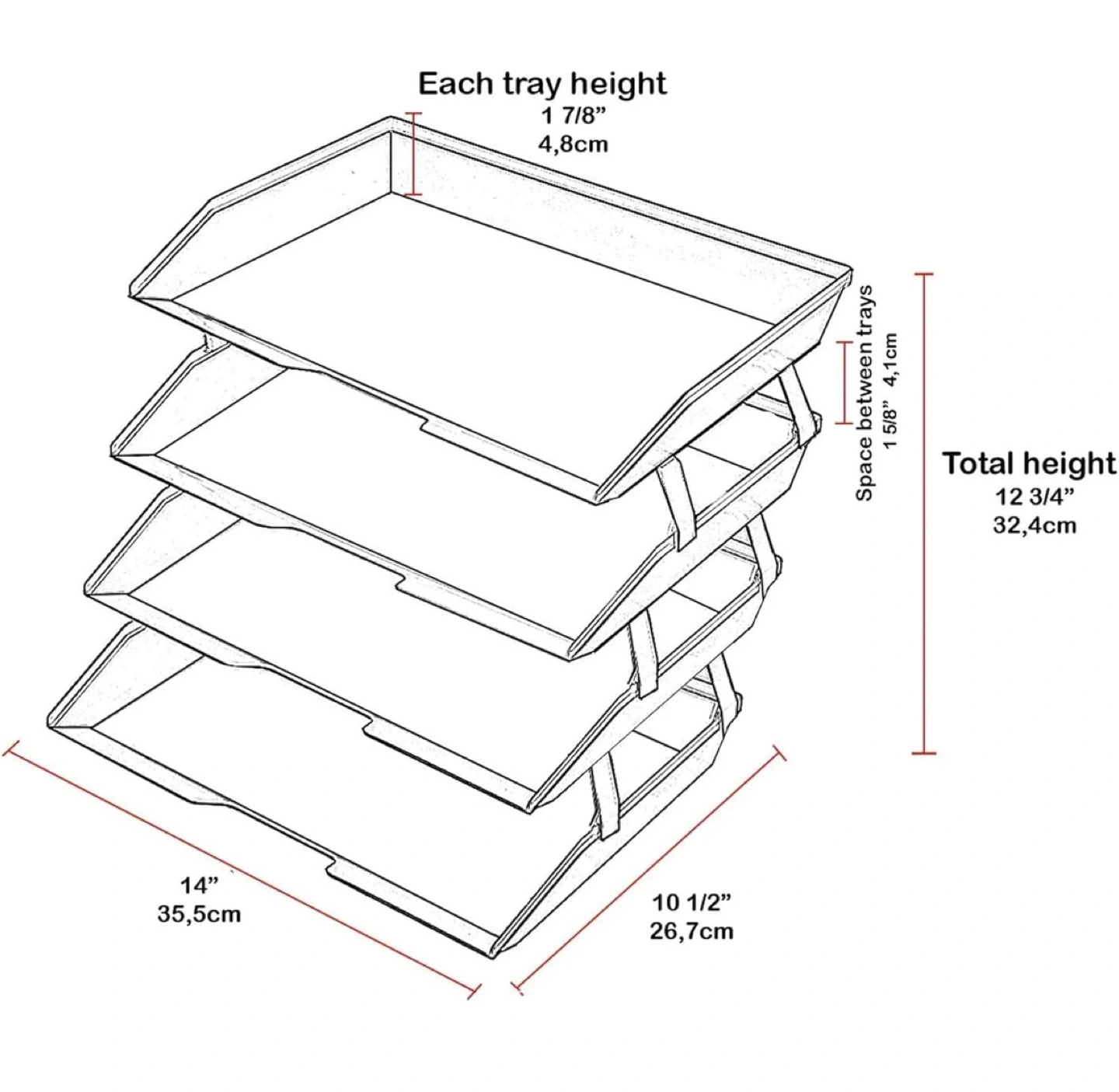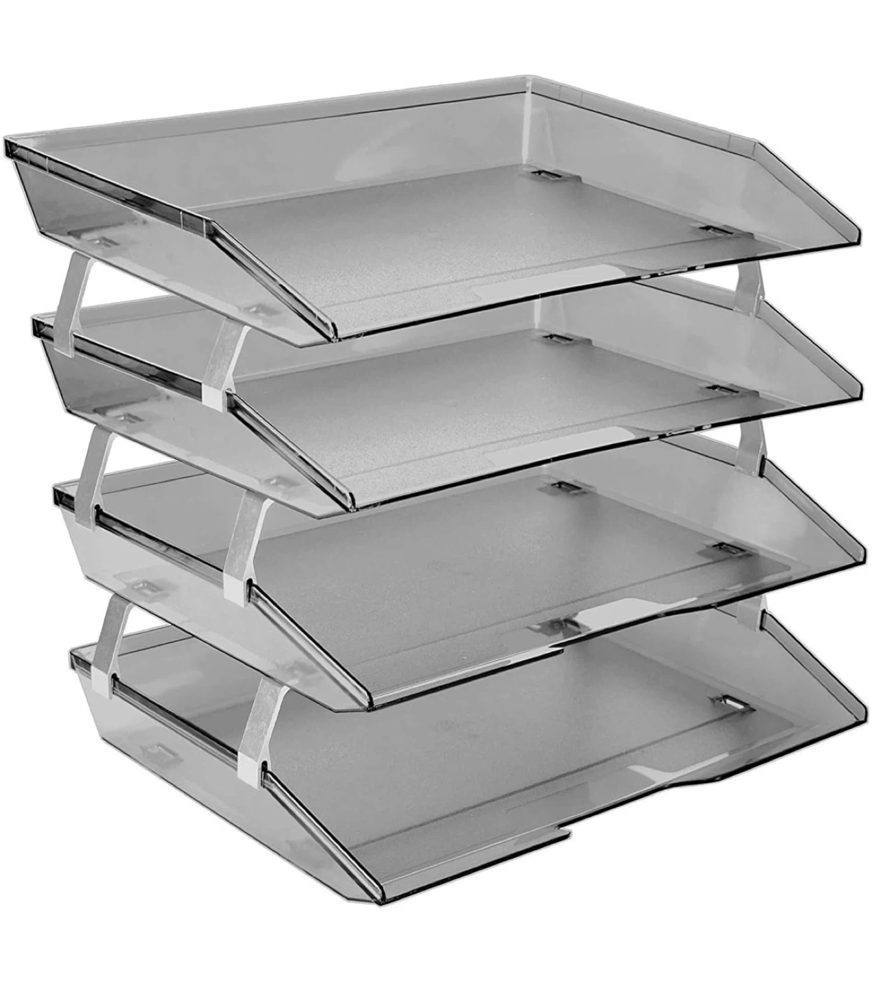 91Declutter your workspace with this handy 4-tier clear acrylic desk file tray organizer! It's perfect for keeping your documents, papers, and files neatly organized and easily accessible. The sturdy aluminum brackets ensure stability, and the anti-slip and scratch bottom pads protect your desk surface. Dimensions: - Each tray height: 1 7/8" (4.8cm) - Space between trays: 1 5/8" (4.1cm) - Total height: 12 3/4" (32.4cm) - Tray size: 14" (35.5cm) x 10 1/2" (26.7cm)