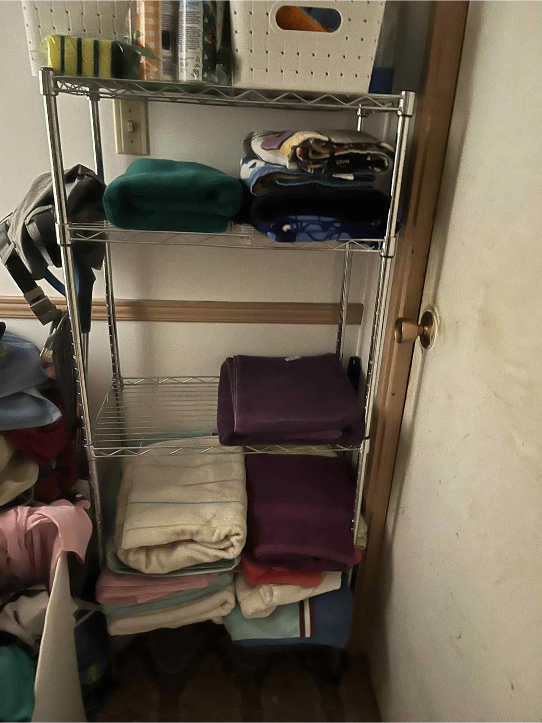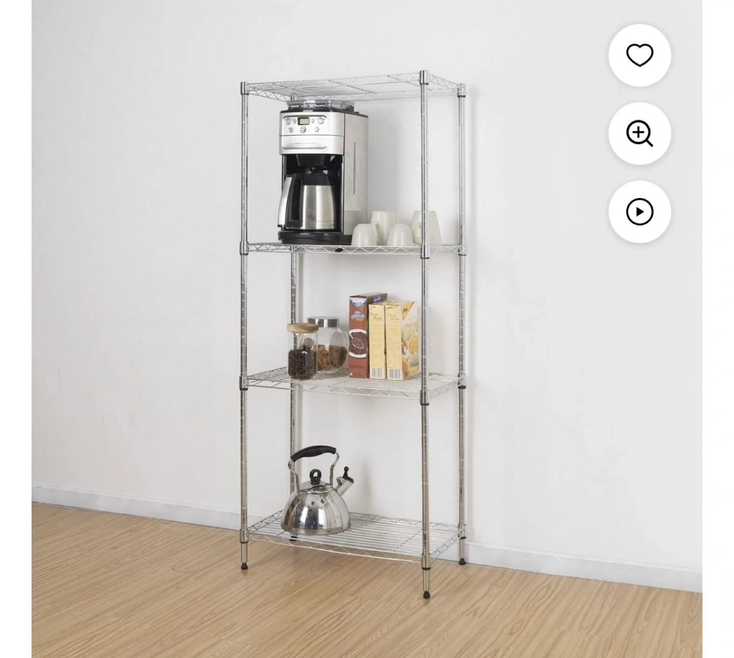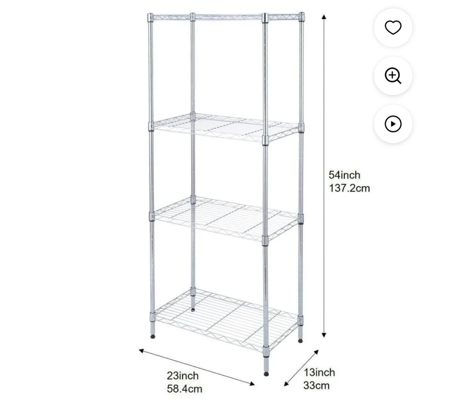 Selling a handy 4-tier wire shelving unit! It's perfect for organizing your kitchen, pantry, or any space that needs a little tidying up. The unit stands at 54 inches tall, with a width of 23 inches and a depth of 13 inches. It's a great way to maximize vertical storage
