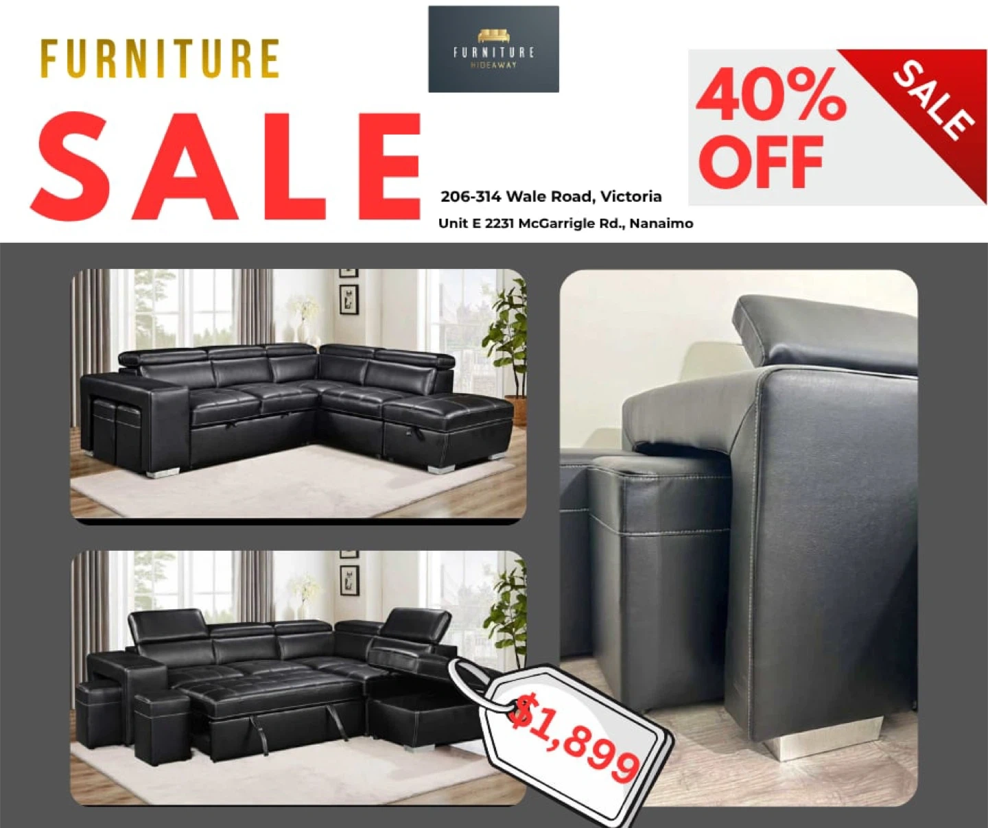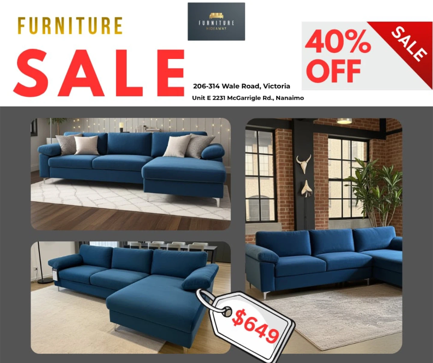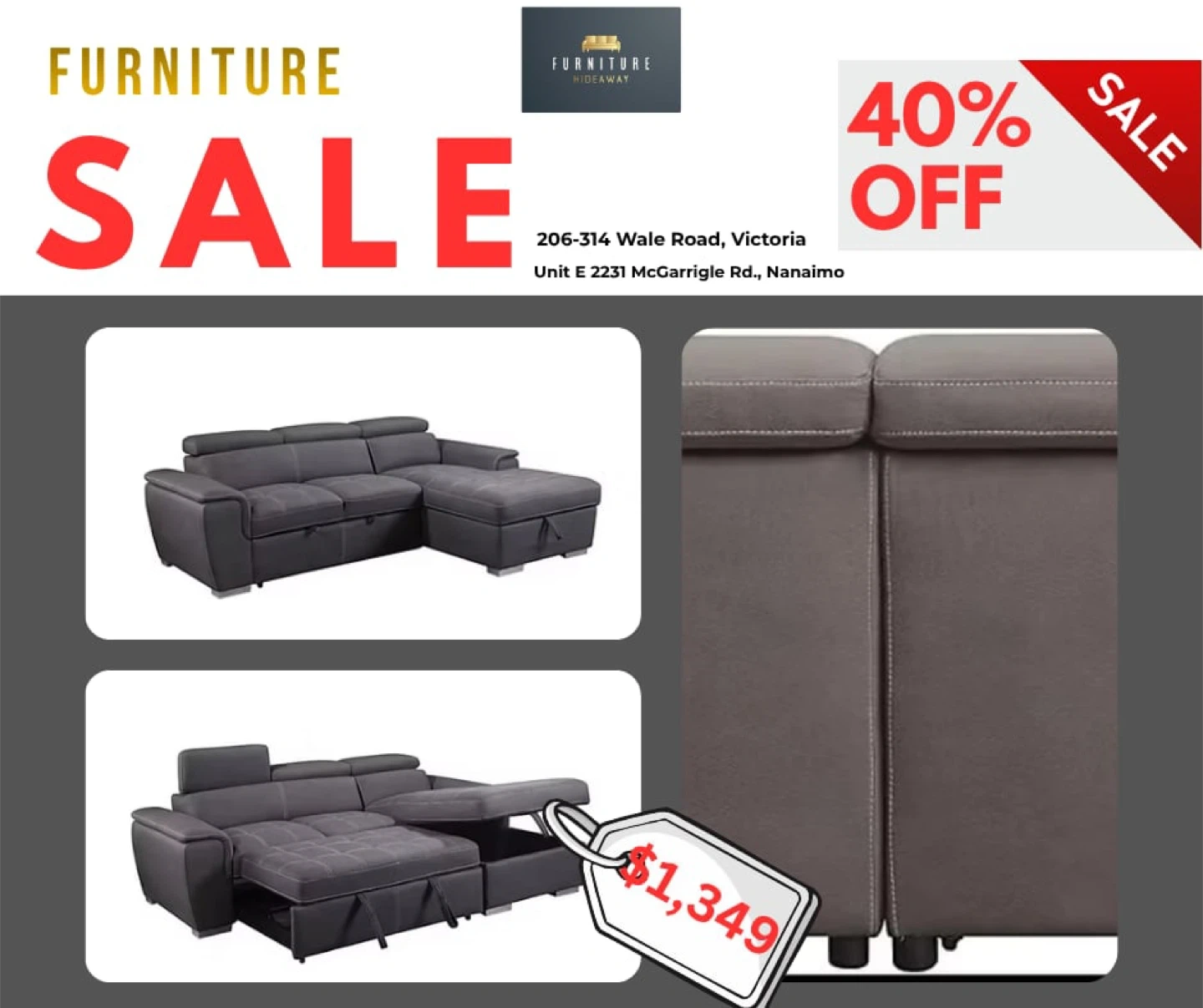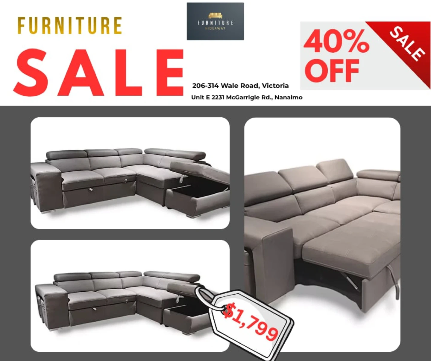 20All couches are brand new and comes unassembled. Includes warranty.🔥 Ranges from $649- $1,899‼️ Feel free to visit our showroom: 📍Victoria: Unit 206-314 Wale Rd Colwood ☎️ Phone: 250-858-5164 Open daily: ⏰Mon-Friday: 11am-7pm ⏰Weekends: 10am-6pm ⏰Holidays ** 11am-5pm** 📍Nanaimo: Unit E -2231 Mcgarrigle Rd, Nanaimo ☎️Phone : 778-700-8382 ⏰Monday- CLOSED ⏰Tuesday to Sunday: 10am-6pm www.furniturehideaway.ca
