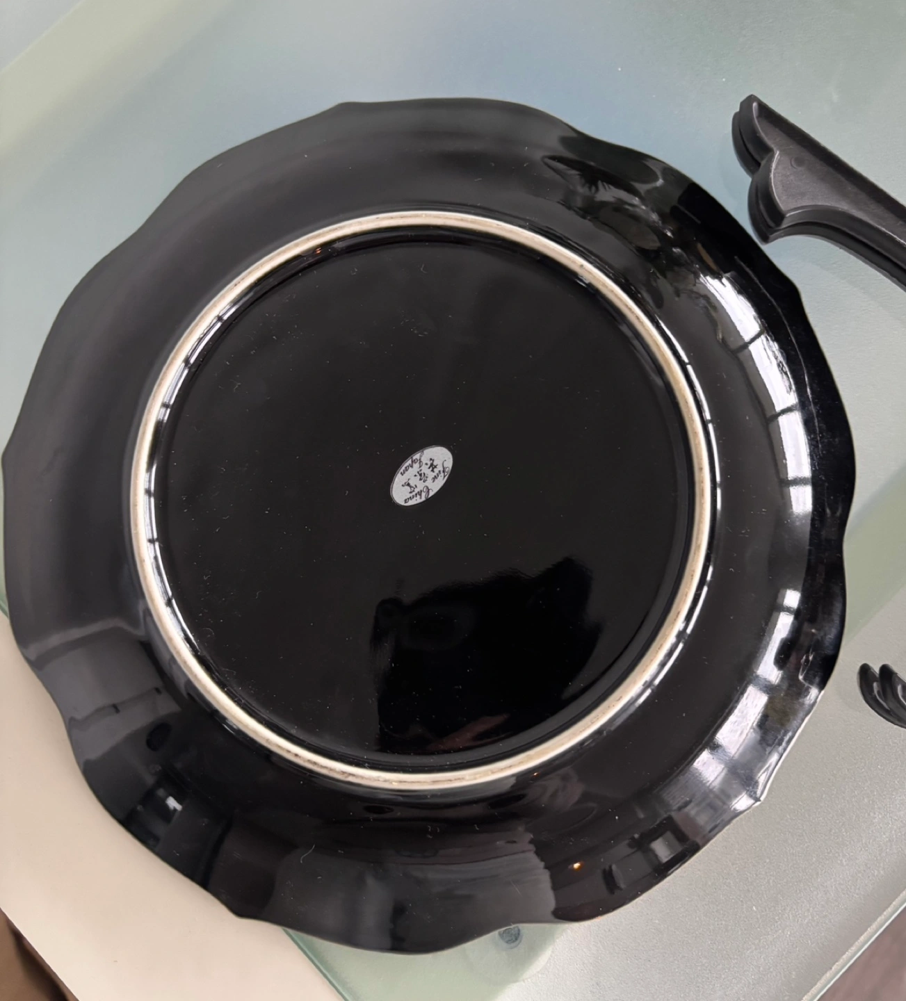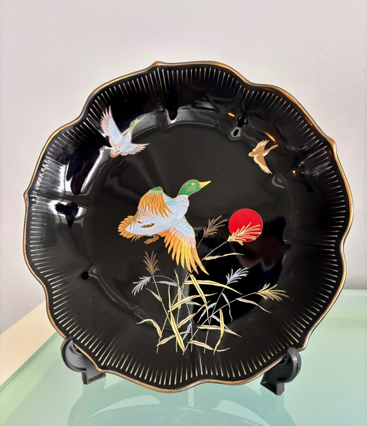 Beautiful vintage decorative black ceramic plate. Features gold detailing and painted ducks. Scalloped edges. Includes a stand for display.