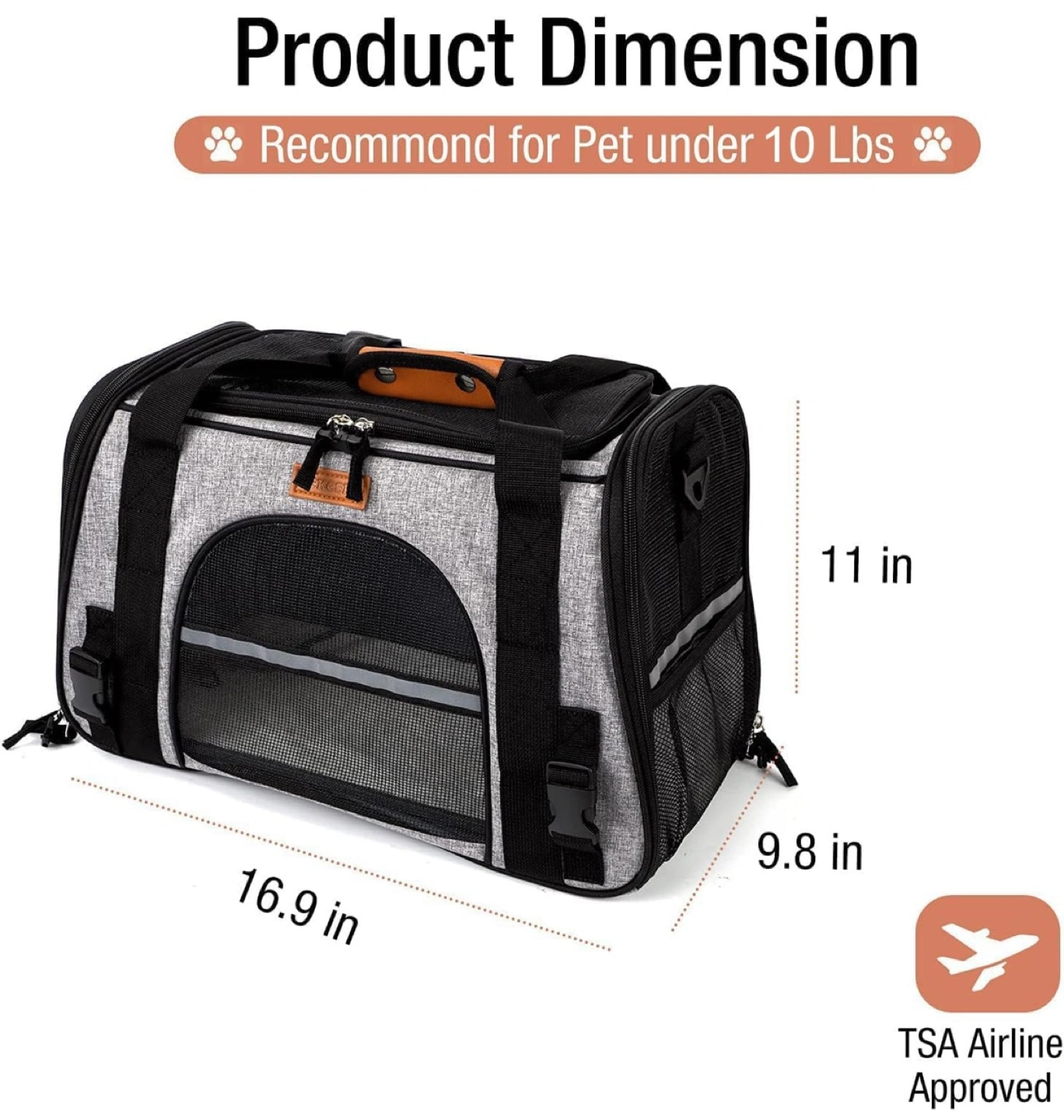 Practical and Portable: This carrier measures 16.9 x 9.8 x 11 inch (LWH). Recommend for pets around 10 lbs (4.5 kg).