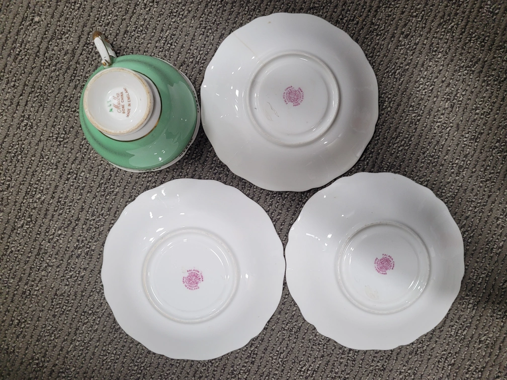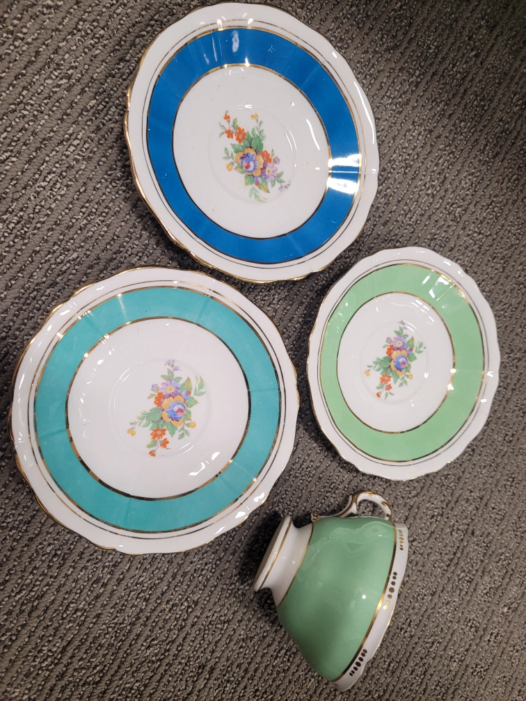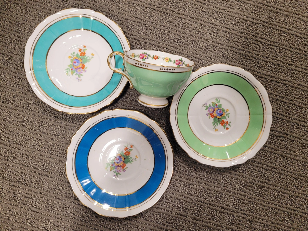 Pretty vintage teacup and three saucers. Mint green teacup with floral details. Saucers in teal, mint green and blue. Gold detailing. Made in England. This is how i acquired them from my oma, 4 together. I just realized the green looks nice together but its not an original cup n saucer set. 2 different markings. The saucers match but different colours. The saucer that matches the cup..... is cracked. So if your alright with a mix and match tea cup n saucer.... take it all. Pickup at 391 attwell drive during monday to friday 830-430 by appointment.