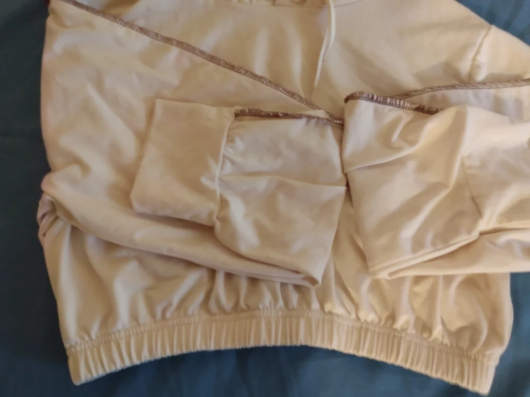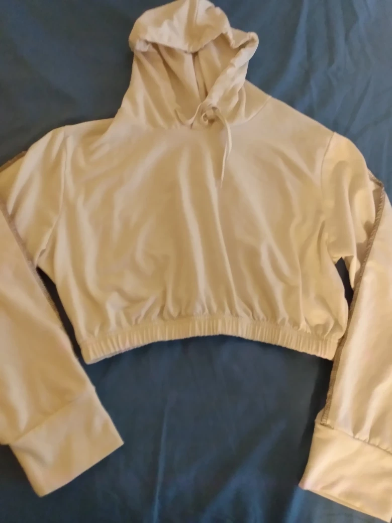 Off white coloured hoodie. Long sleeves. Elastic waistband. Drawstring hood. 95% Polyester 6% Spandex Machine washable. Non smoking home and pet free. I can deliver to any Skytrain Station you choose or if your not near one no problem. OBO