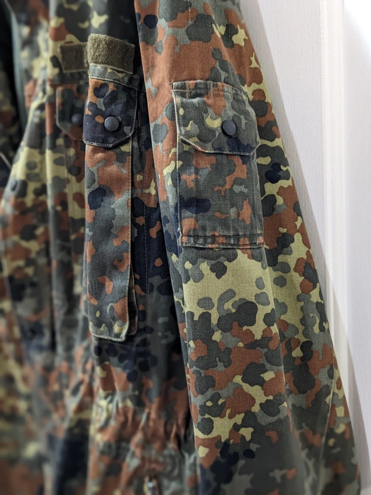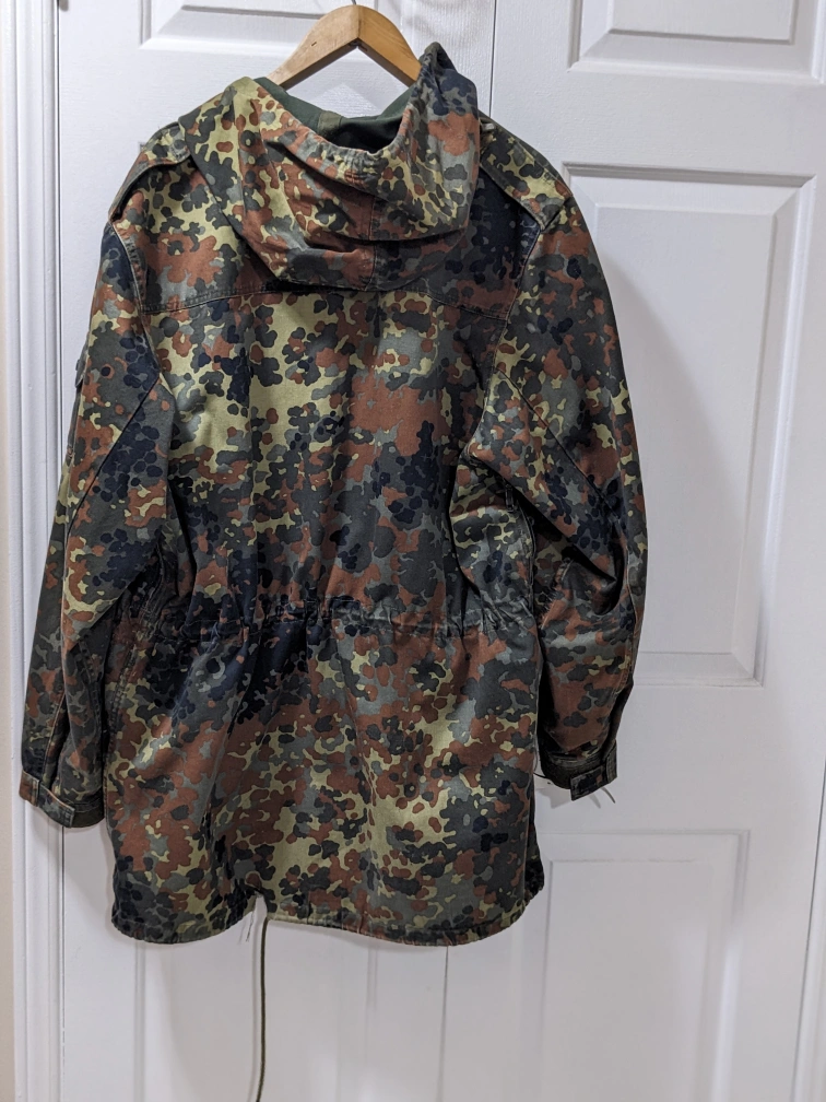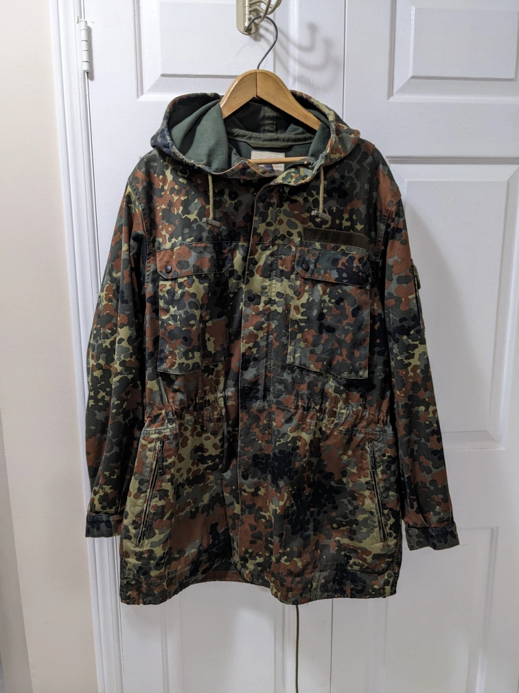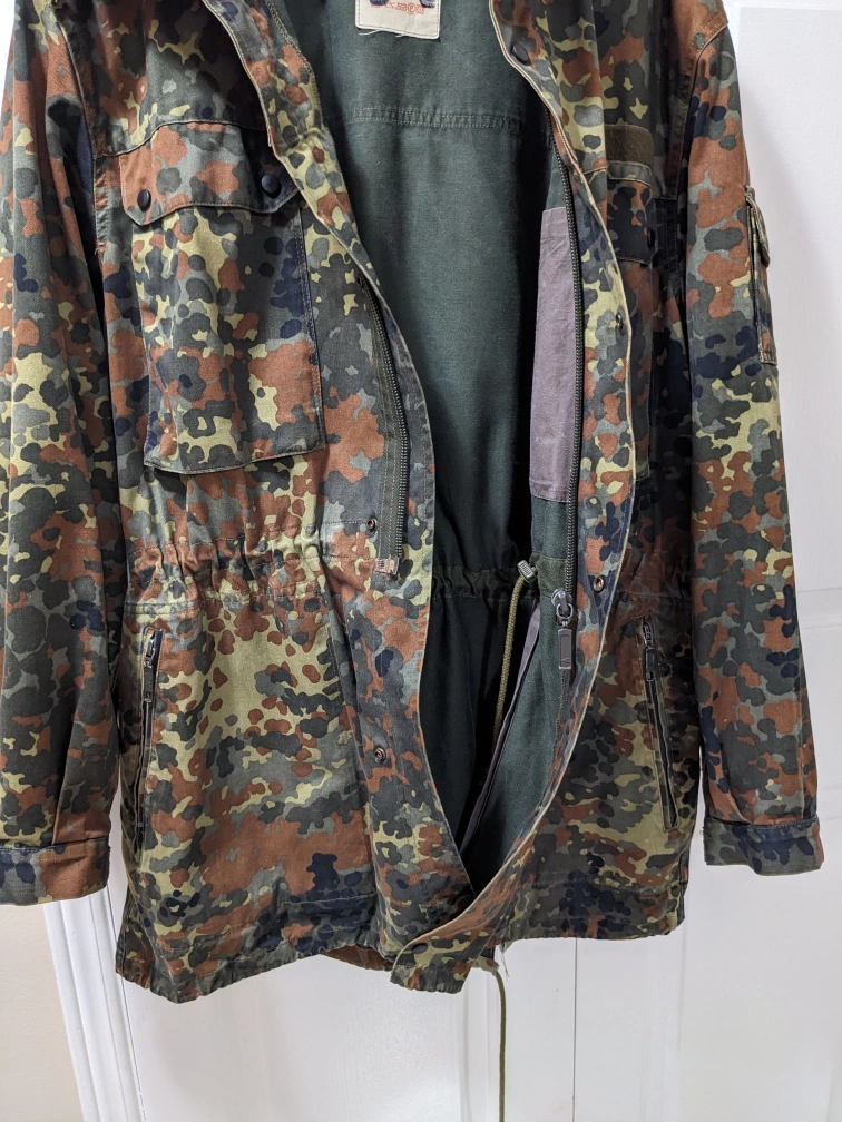 1000+Camouflage jacket. Features a drawstring waist, multiple pockets, and a hood. Great for outdoor activities. Size XL