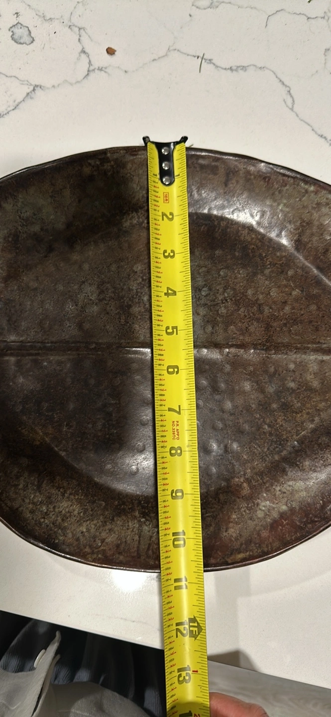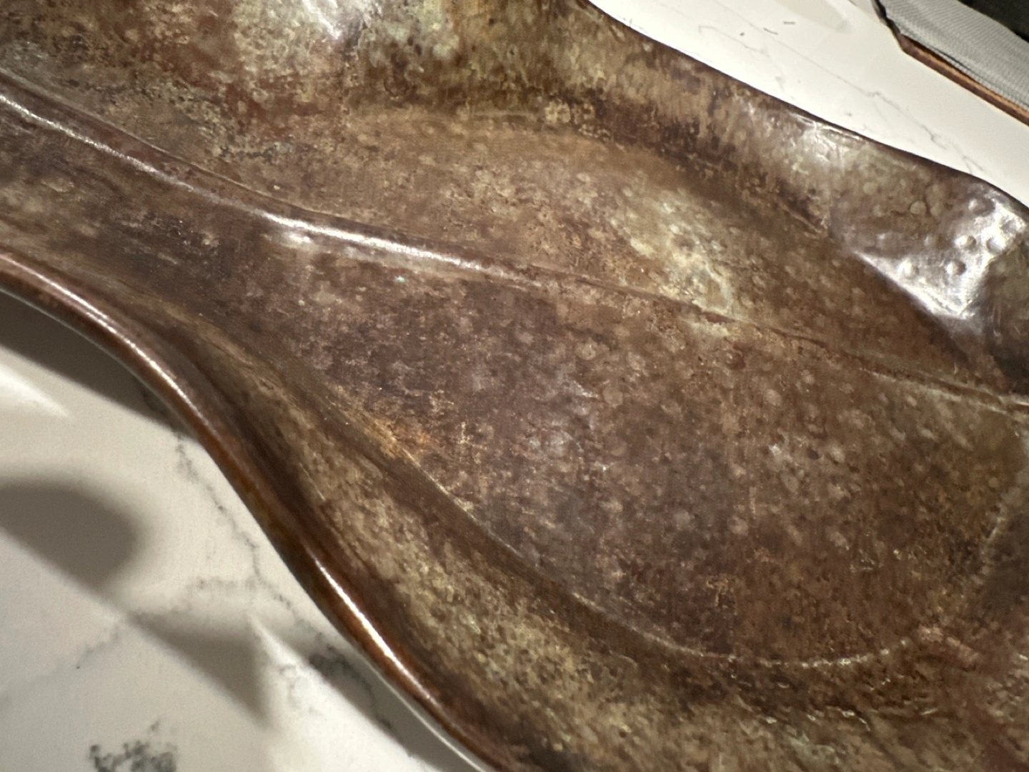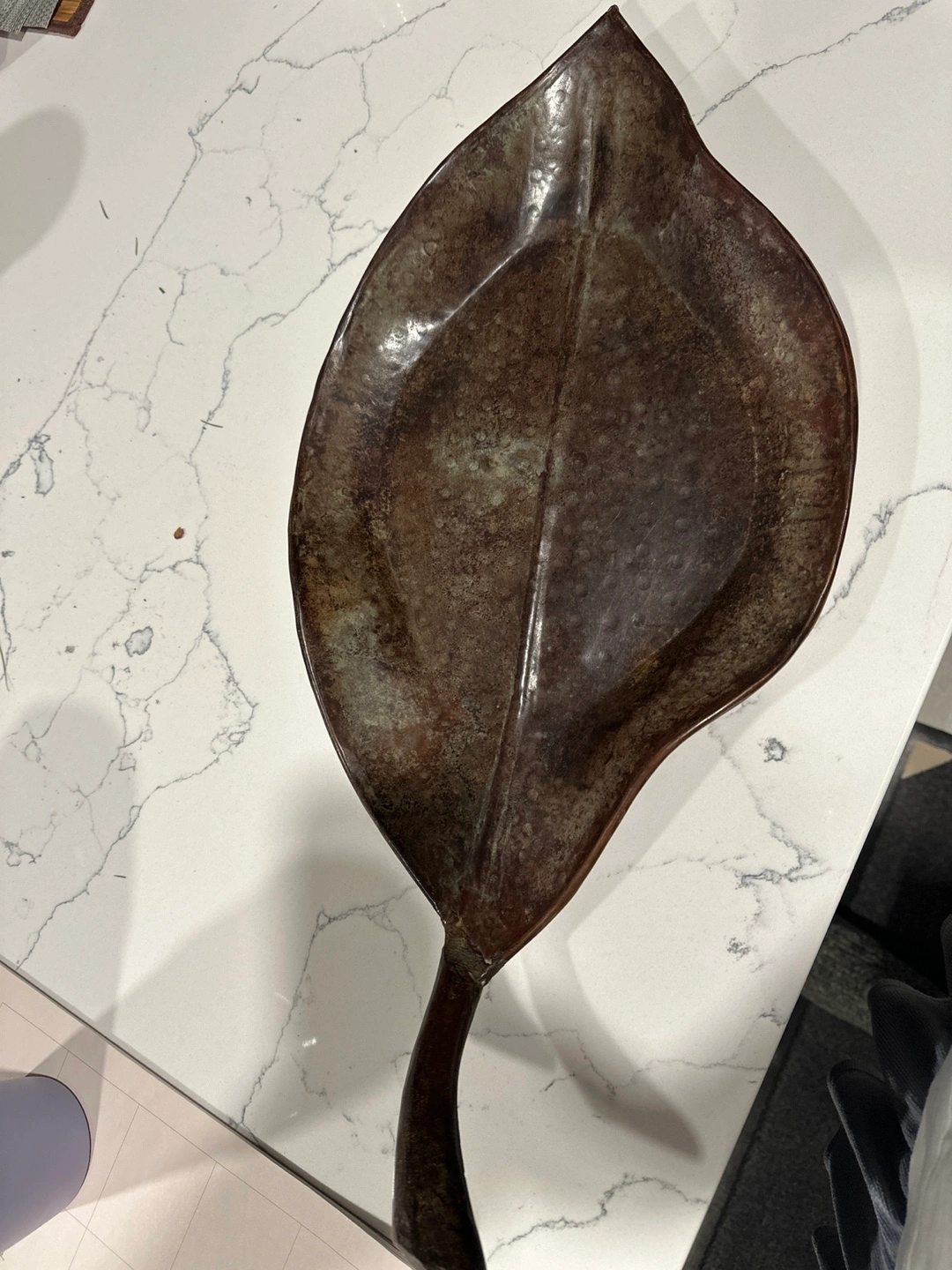 71Unique dark brown metal tray. Leaf design. Measures approximately 23 inches long. Great for serving or display.