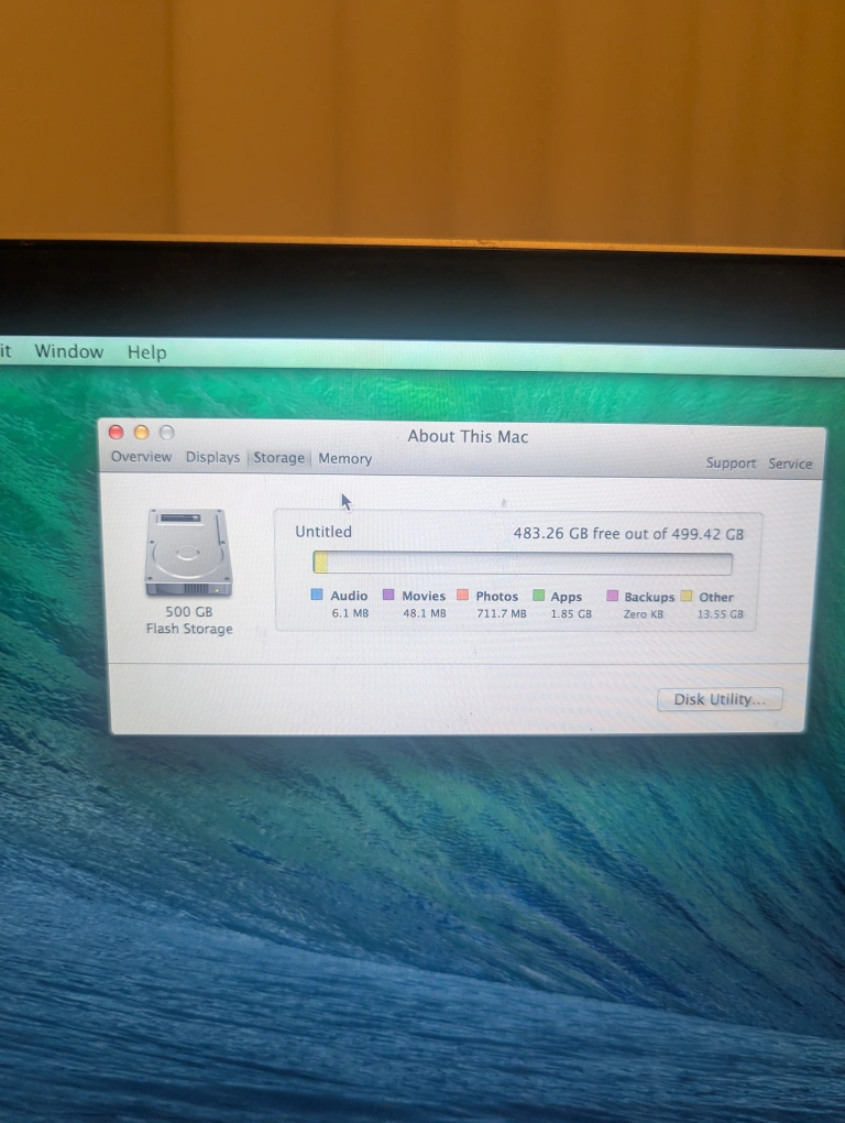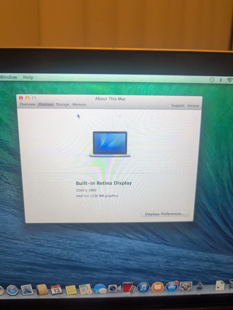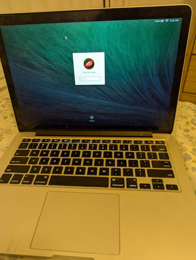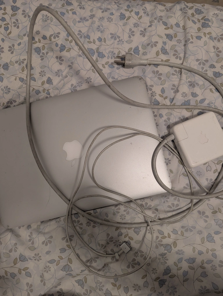 Used MacBook Pro (bought in 2015). Includes power adapter. Silver aluminum body. Some cosmetic wear. 8 GB of RAM. 500 GB of flash storage. OS X 10.9.5 installed.