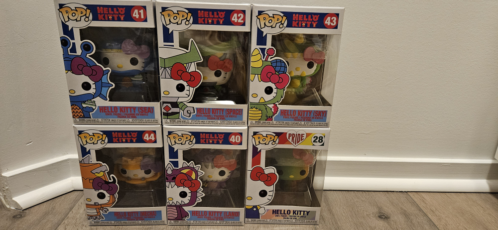 Collection of Hello Kitty Funko Pop vinyl figures - includes Sea, Space, Sky, Mecha, Land, and Pride themes.
