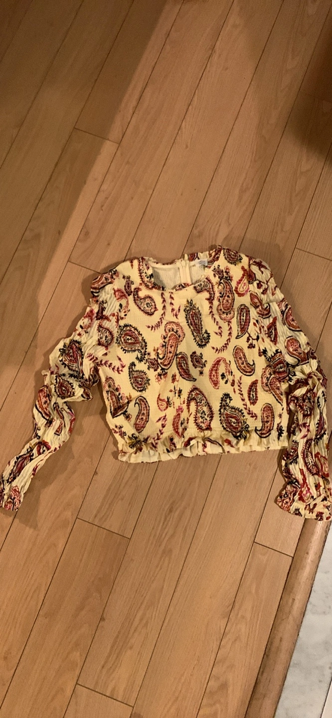 Long sleeve crop top. Paisley print. Cream colour. Ruffled hem and sleeves.