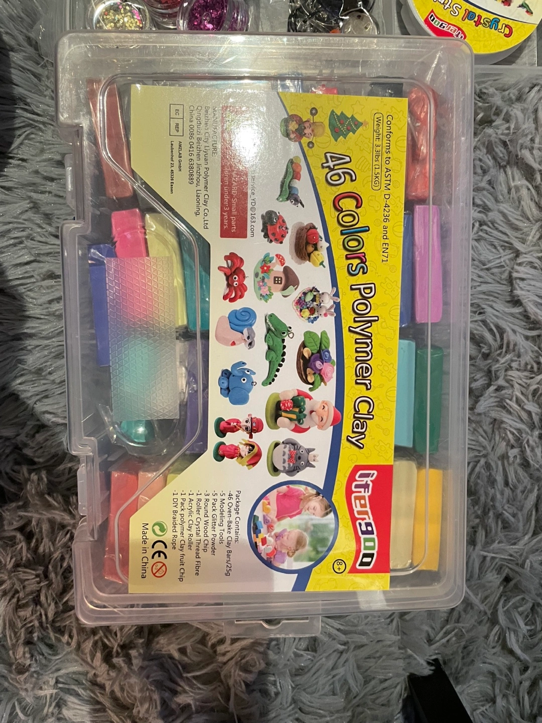 Large polymer clay set. Includes 46 colours of clay, sculpting tools, jewellery findings, glitter, and string. Perfect for crafting and jewellery making. Colours on the top of the tray have been used, majority of colours are still brand new. All accessories are brand new and all tools are included.