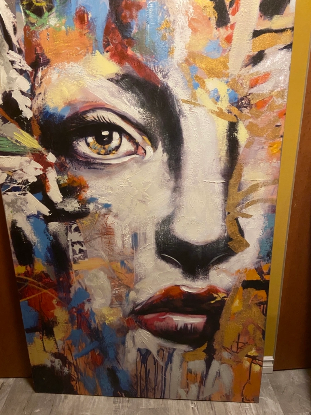 Stunning large canvas print featuring an abstract portrait of a woman. Vibrant colours and textures. Ready to hang, with wire and hanging hardware attached. Perfect for adding a modern touch to your home décor.