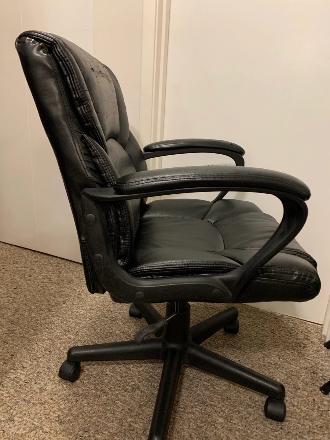 FREE - small office chair suited to short and petite people. Height adjustment and wheels work well. There is no adjustment for the back. The faux leather is starting to peel. I had a chair cushion over it to cover.