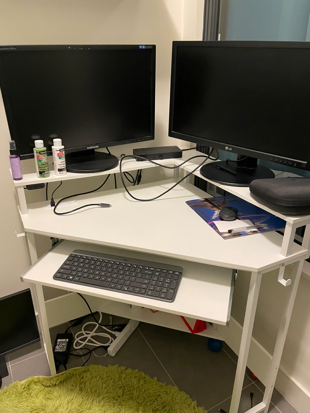 Great for small spaces. Very compact and enough space for 2x monitors and keyboard. Great condition and hardly used.