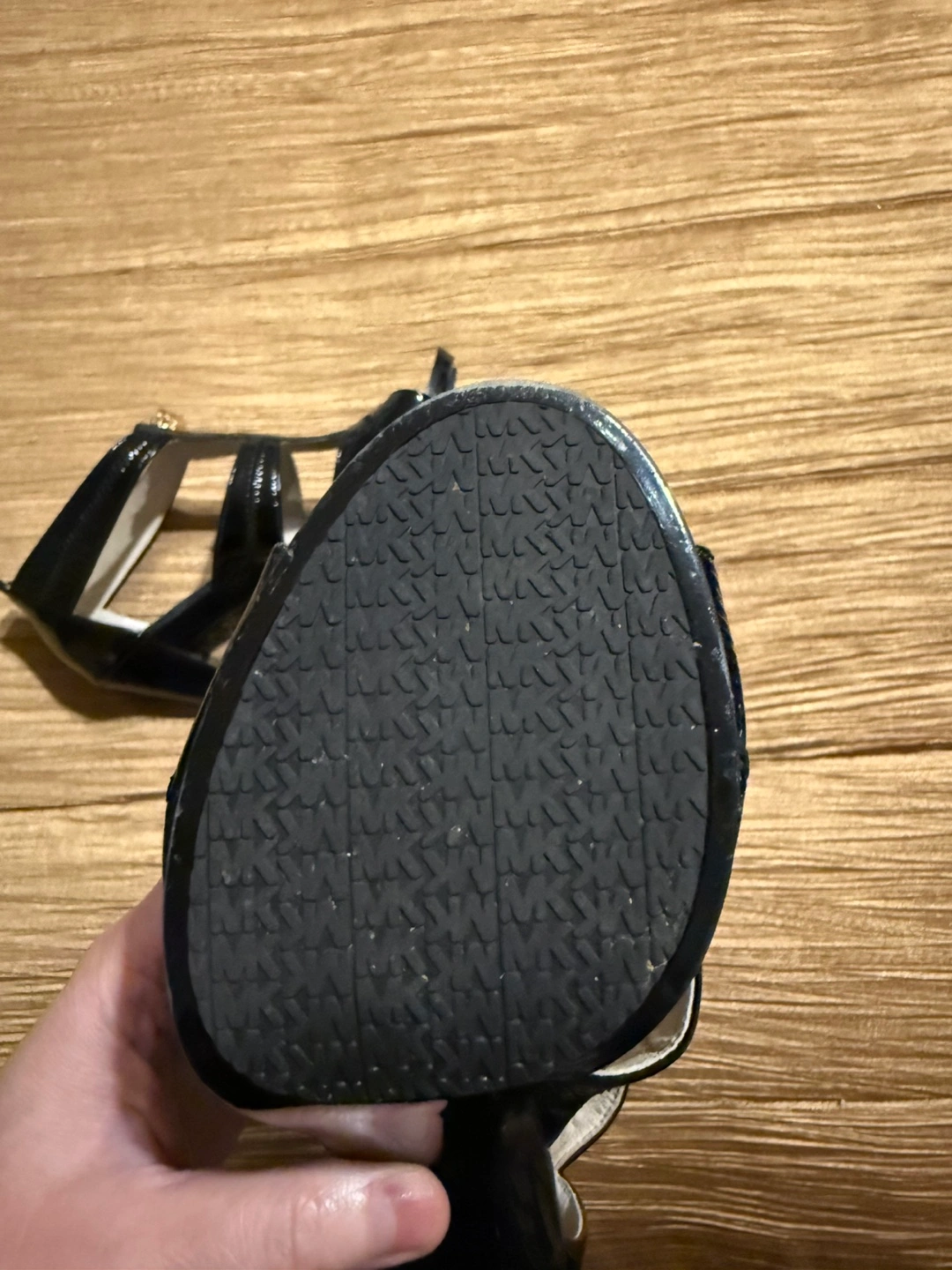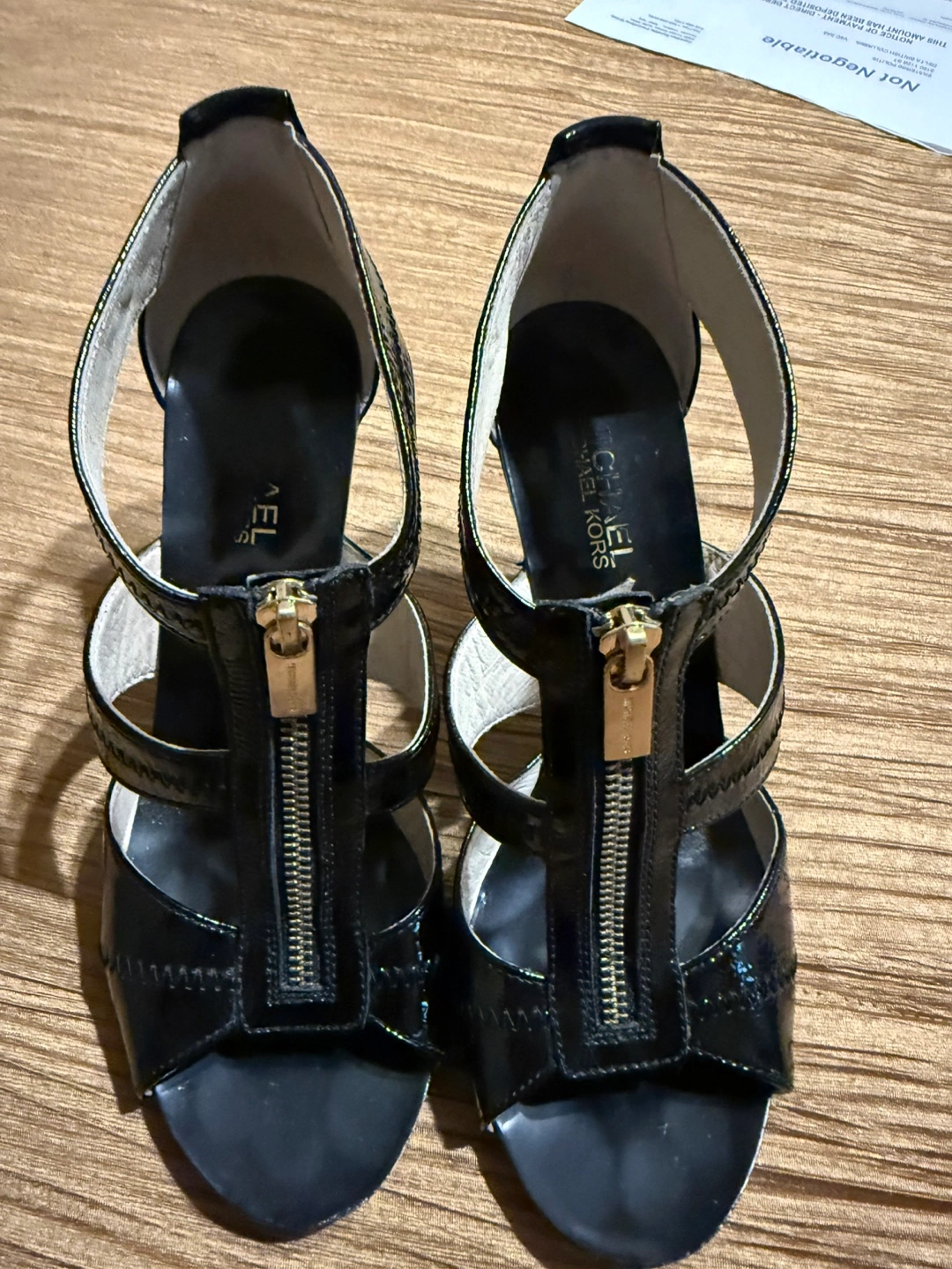 32Elegant black patent leather sandals. Features a zip closure and stiletto heel. Open toe design. Size not specified.