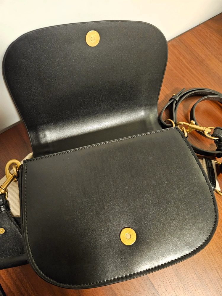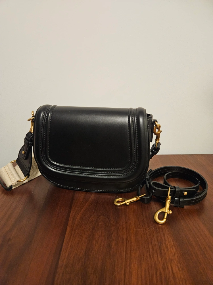 Stylish black leather saddle bag. Features a gold-toned hardware and adjustable strap. Roomy interior with zippered pocket. Perfect everyday bag. Never used. In perfect condition.