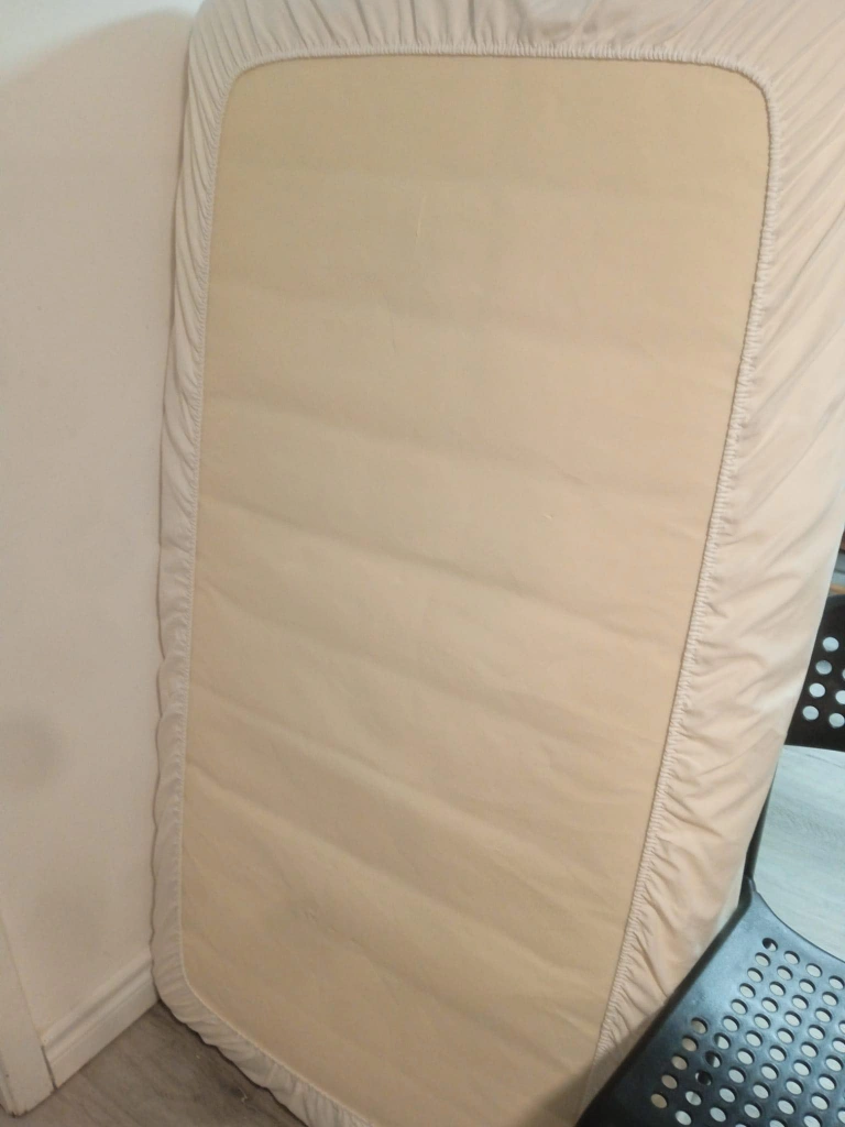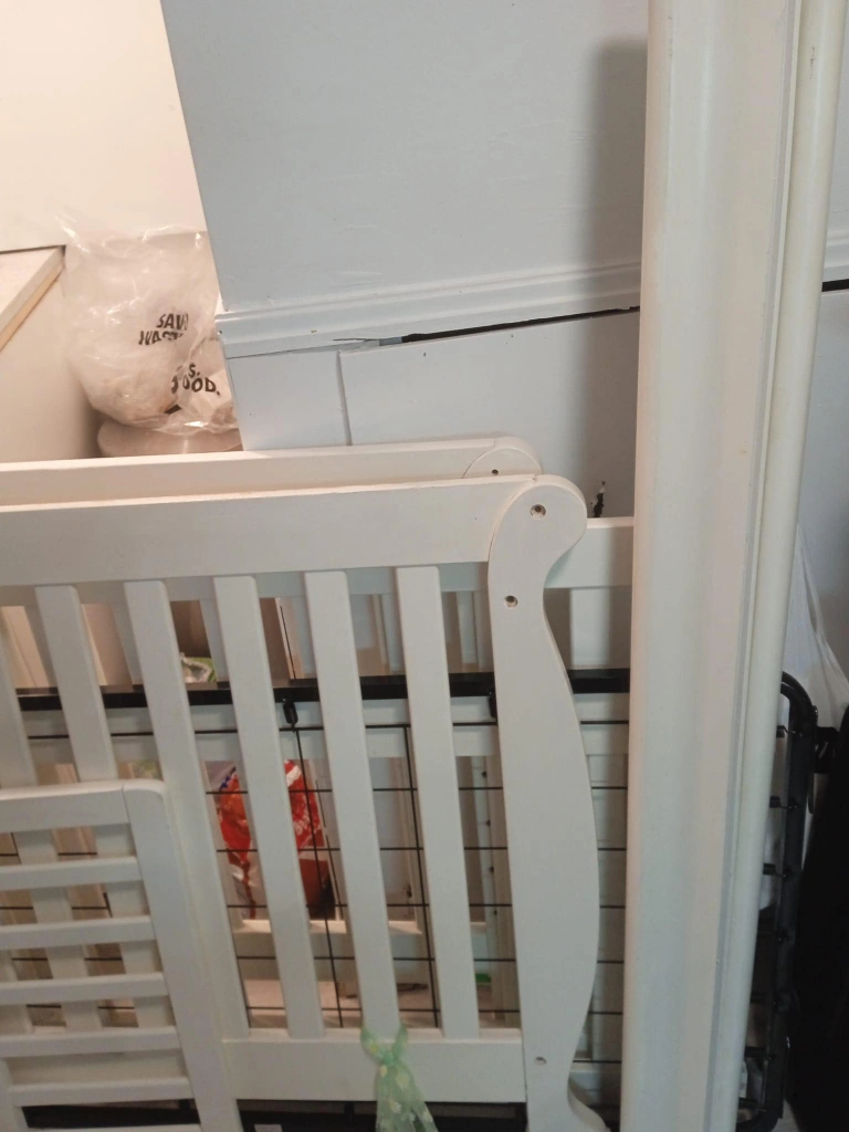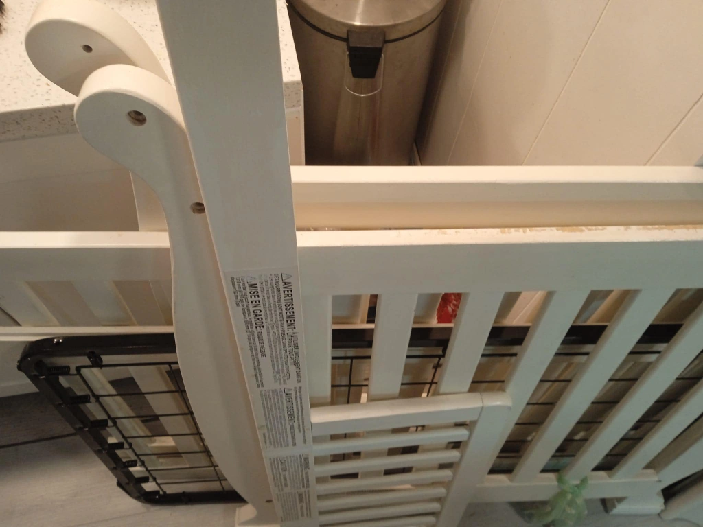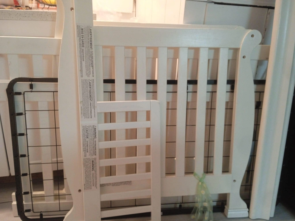 Convertible crib and toddler rail, off-white finish. Includes a mattress pad. barely used. very new. 0 month to 5 years baby to todler can sleep.