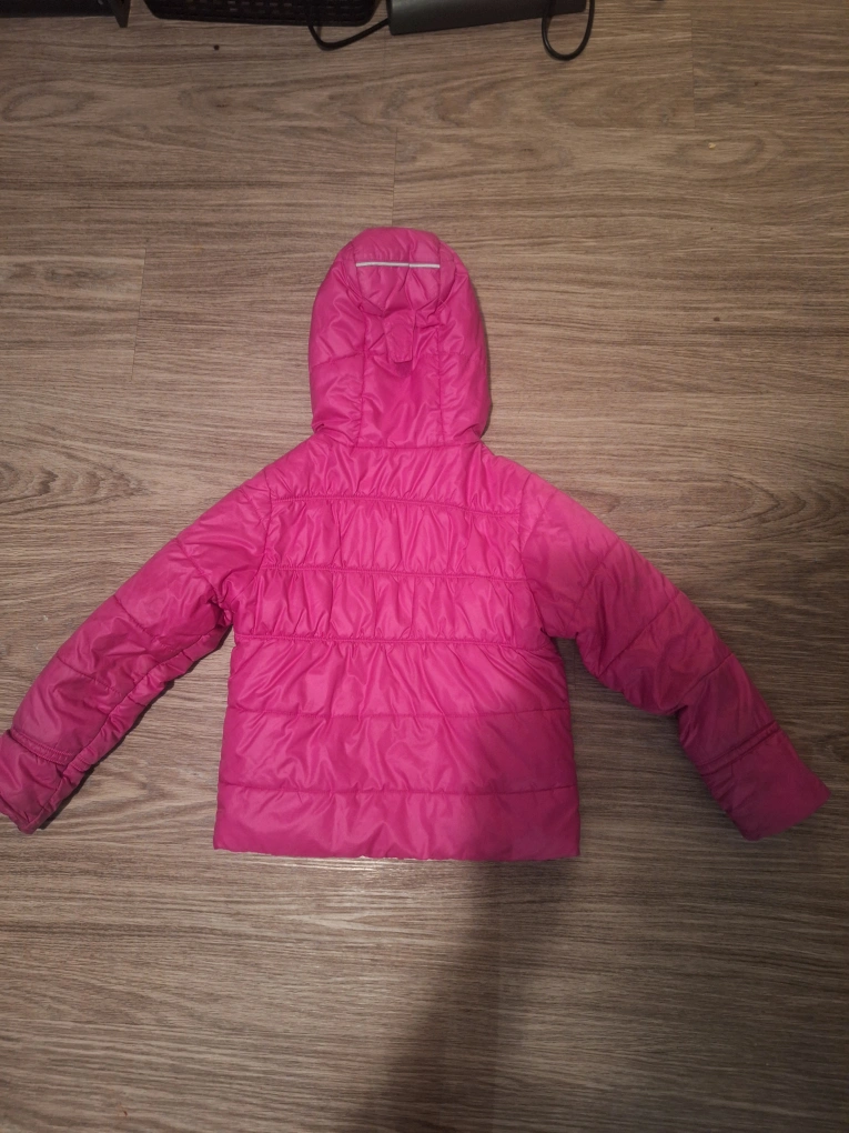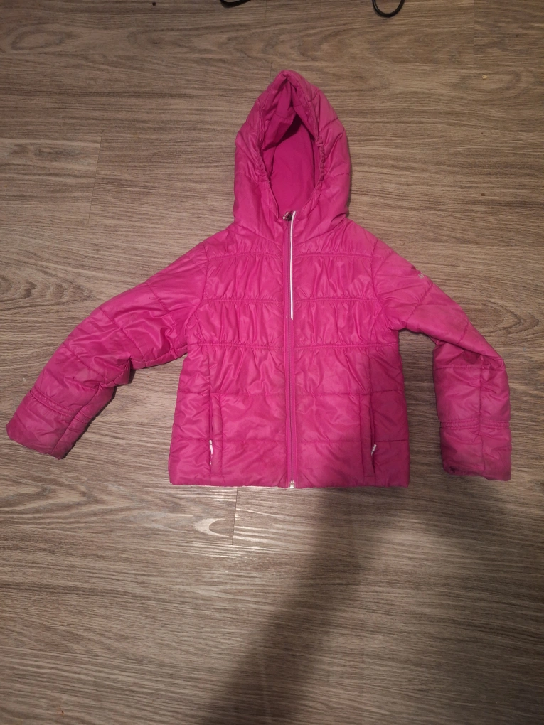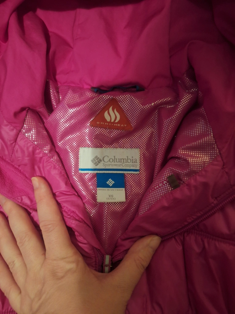 Girls' pink puffer jacket. Features a hood and zip closure. Omni-Heat technology. Size XS.