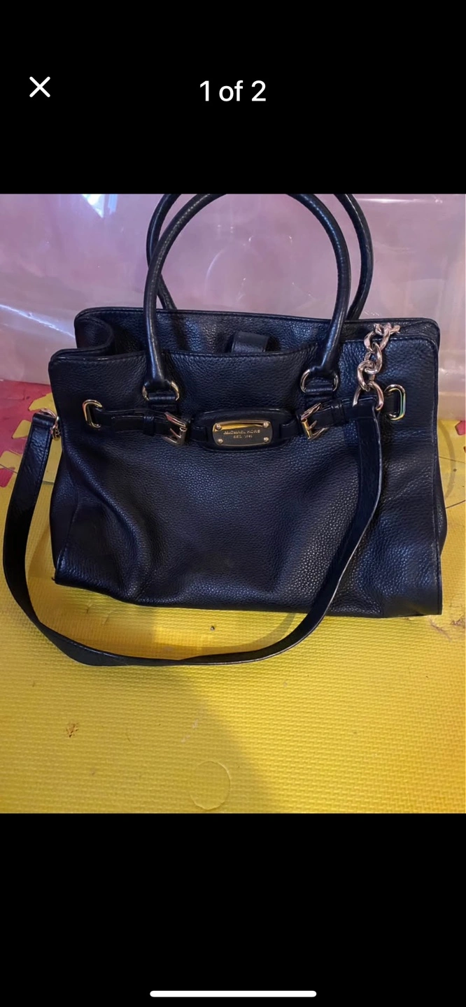 Gorgeous black leather Micheal Kors handbag. Features gold-tone hardware. Top handles and a detachable shoulder strap. Multiple interior compartments. Pre-owned, only used couple times