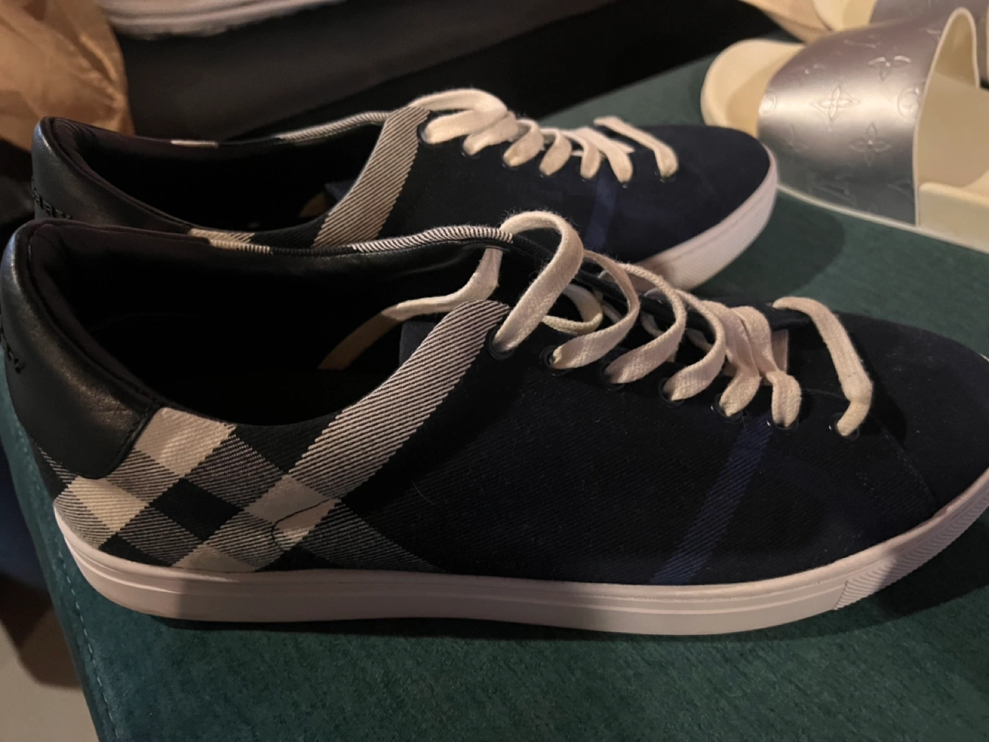 Pair of Burberry low-top sneakers. Navy blue and white check pattern. White laces. Leather accents. Casual style.the shoes are real not fake only wore shoes couple times