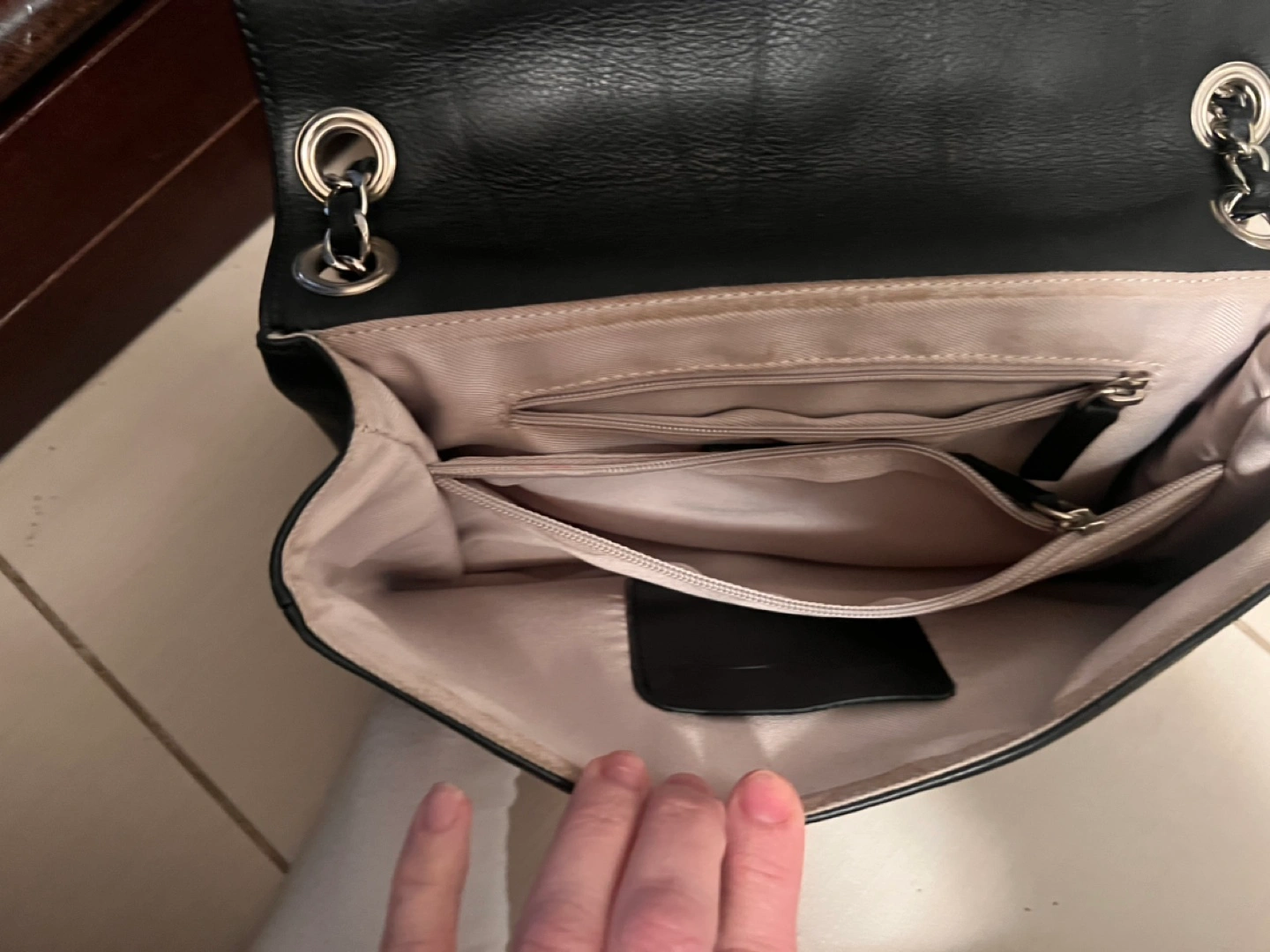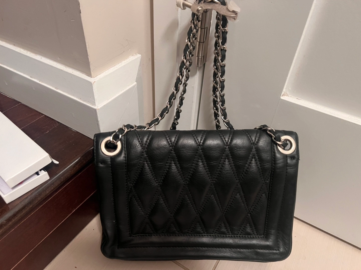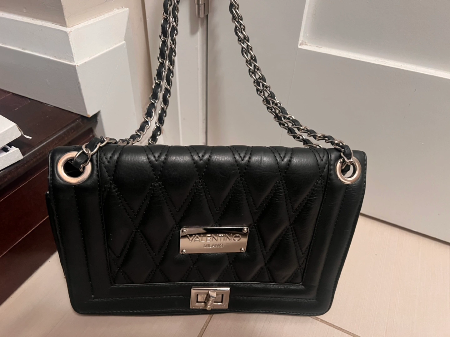 Black quilted leather Valentino shoulder bag. Silver chain strap. Flap closure. Interior pockets. Pre-owned.