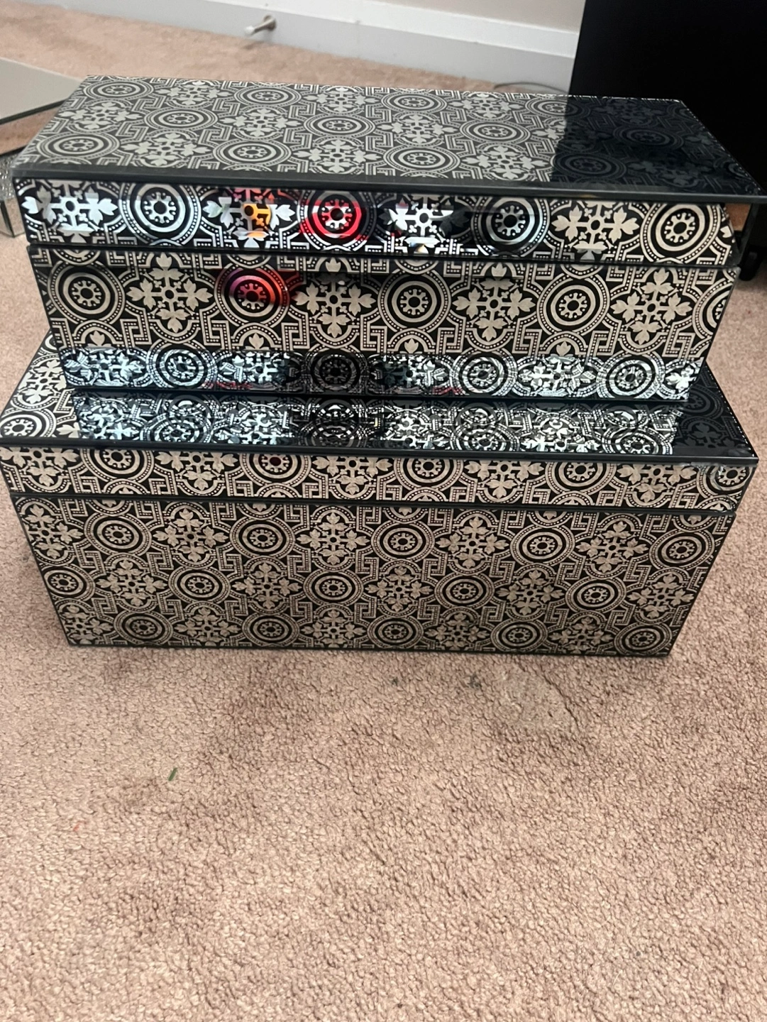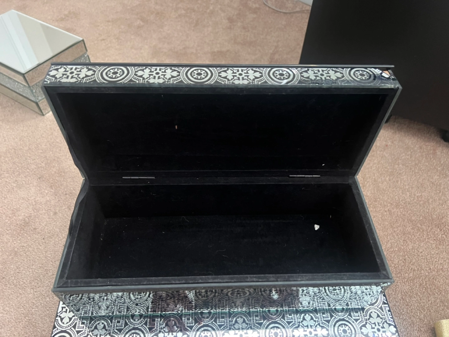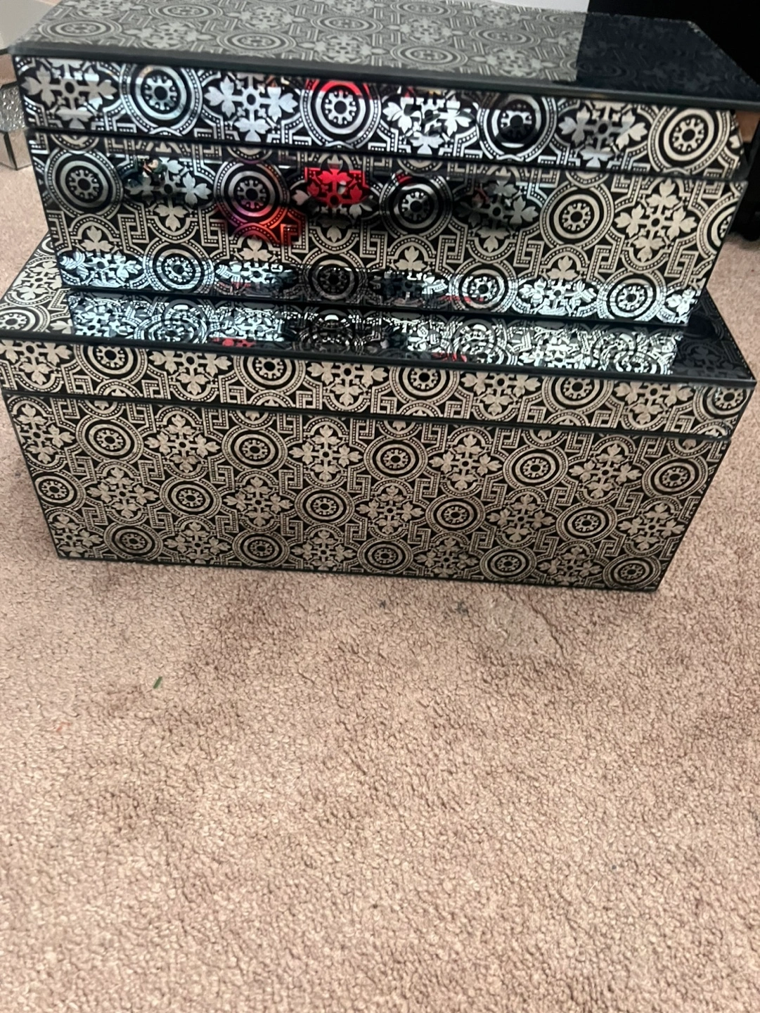 Beautiful set of two decorative boxes. Black mirrored finish with silver patterned design. Black velvet interior. Perfect for organizing jewellery or other small items. Great for adding a touch of elegance to any space.