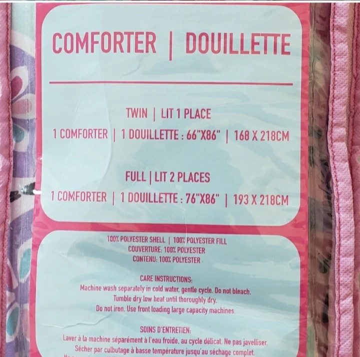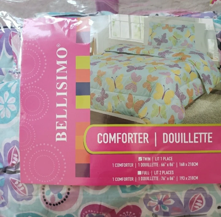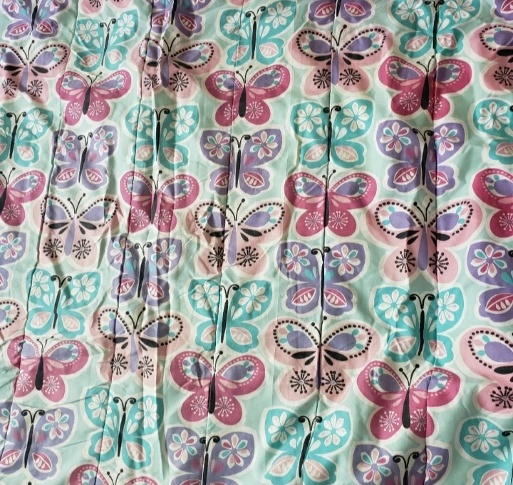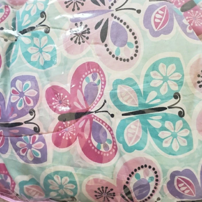 Features a pastel butterfly pattern. 100% polyester shell and fill. Machine washable.