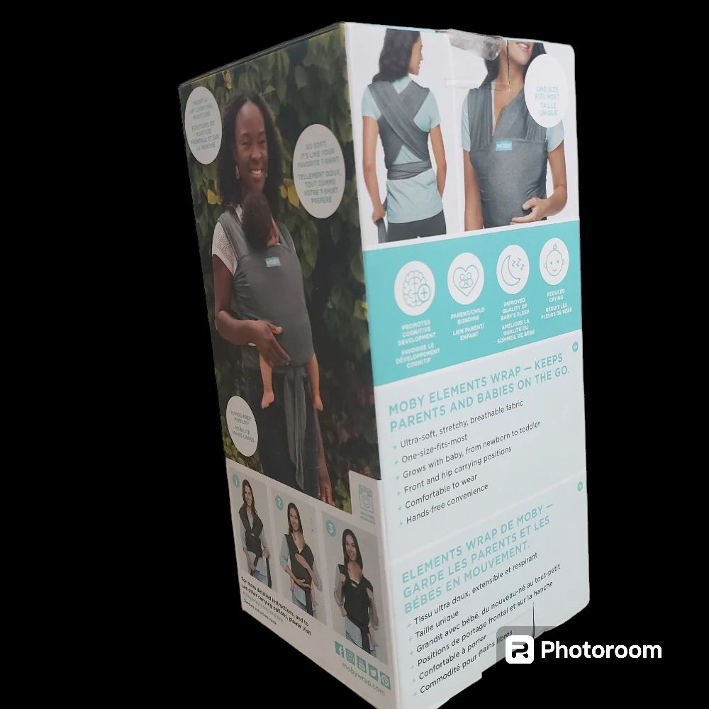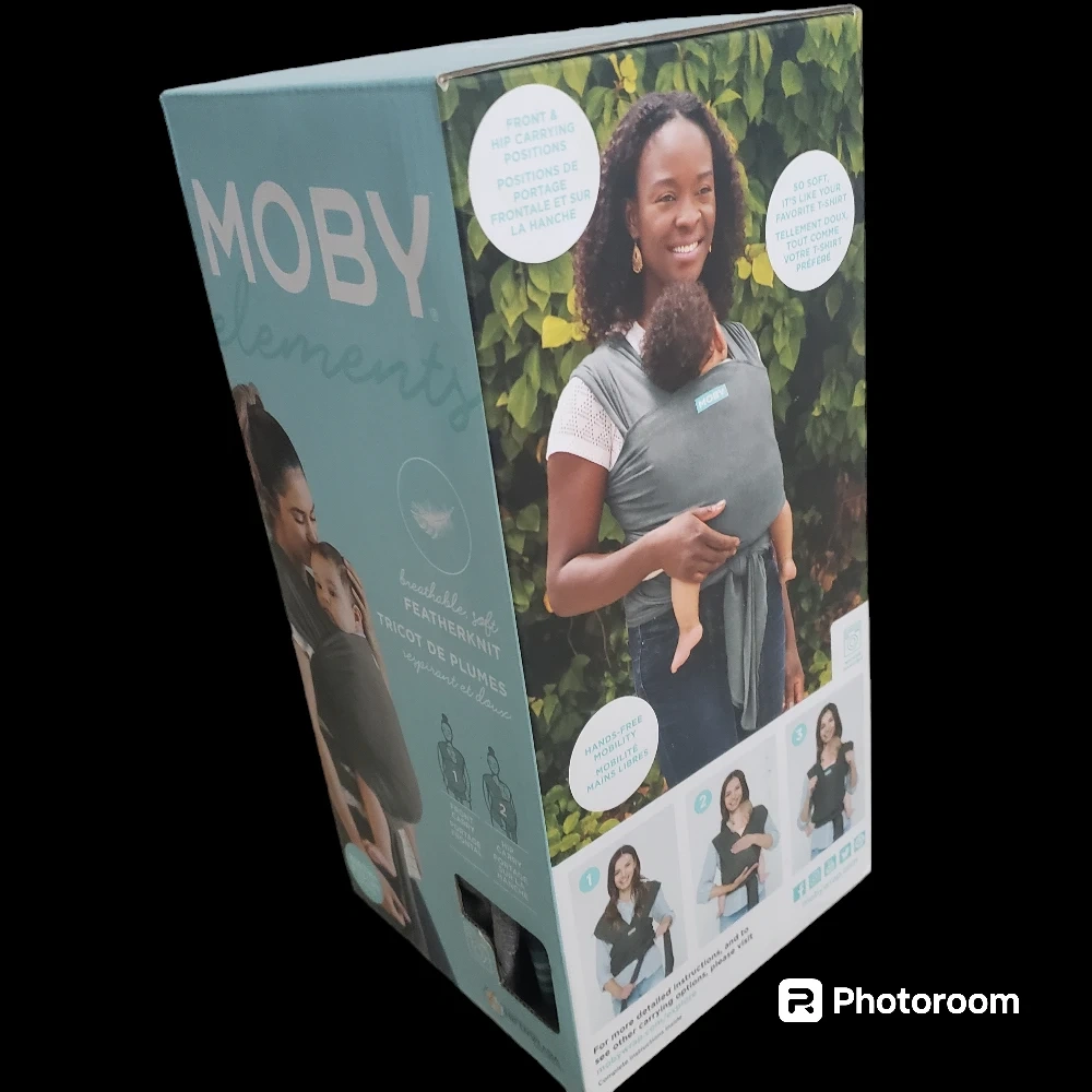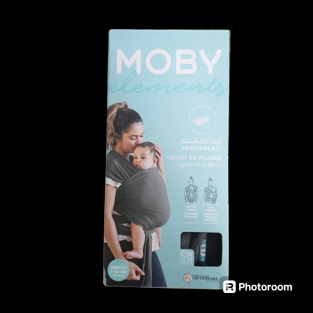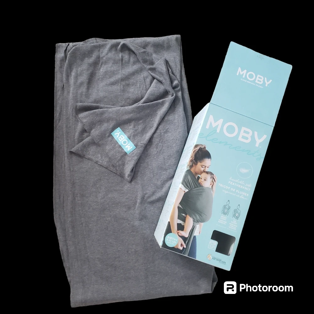 New Moby Elements baby wrap. Breathable, soft fabric. Multiple carrying positions. Suitable from birth to 33 lbs.