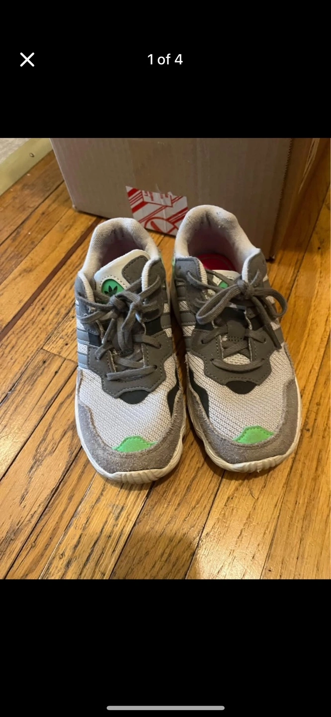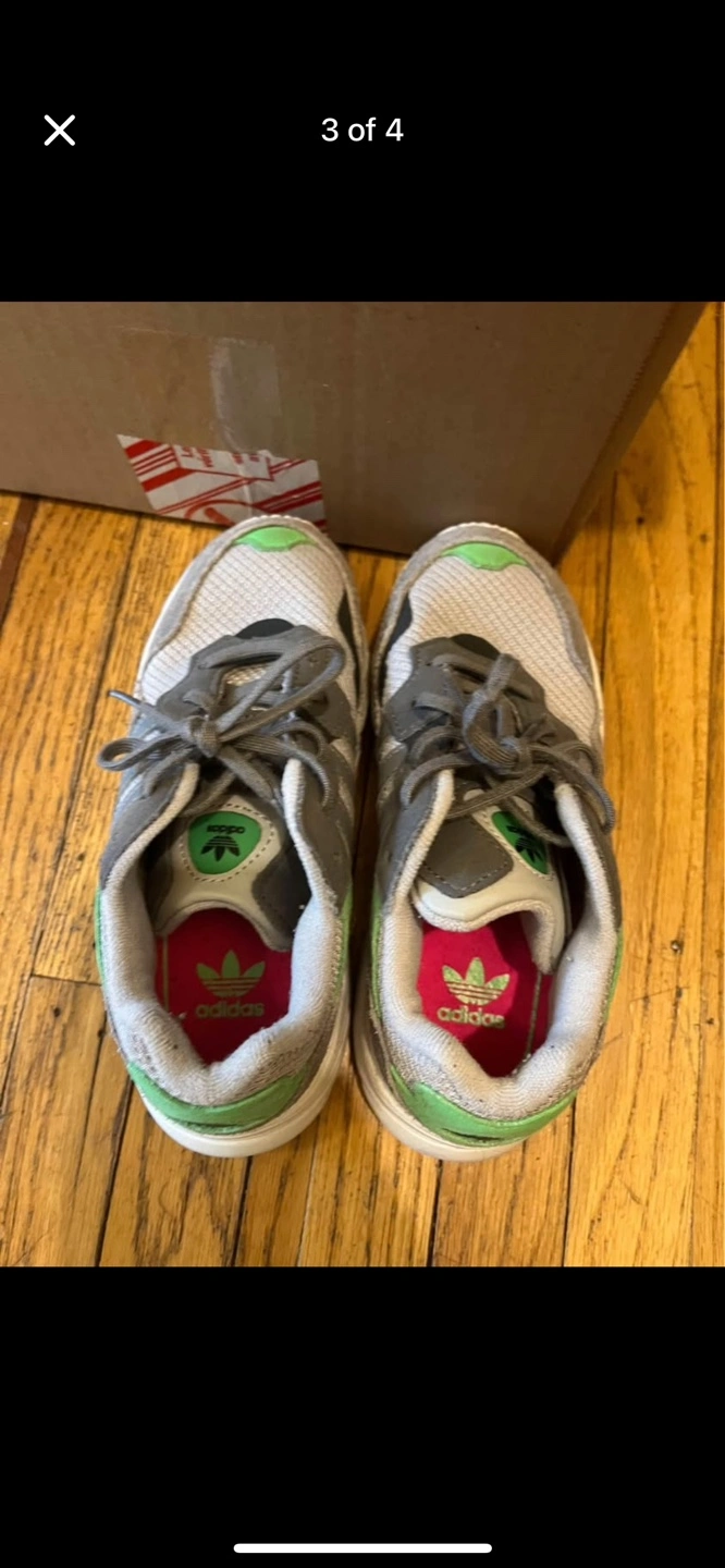 Adidas Yung-1 sneakers. Grey, green, and white colour scheme. Lace-up closure. Good condition. Size shown in image. 13k size