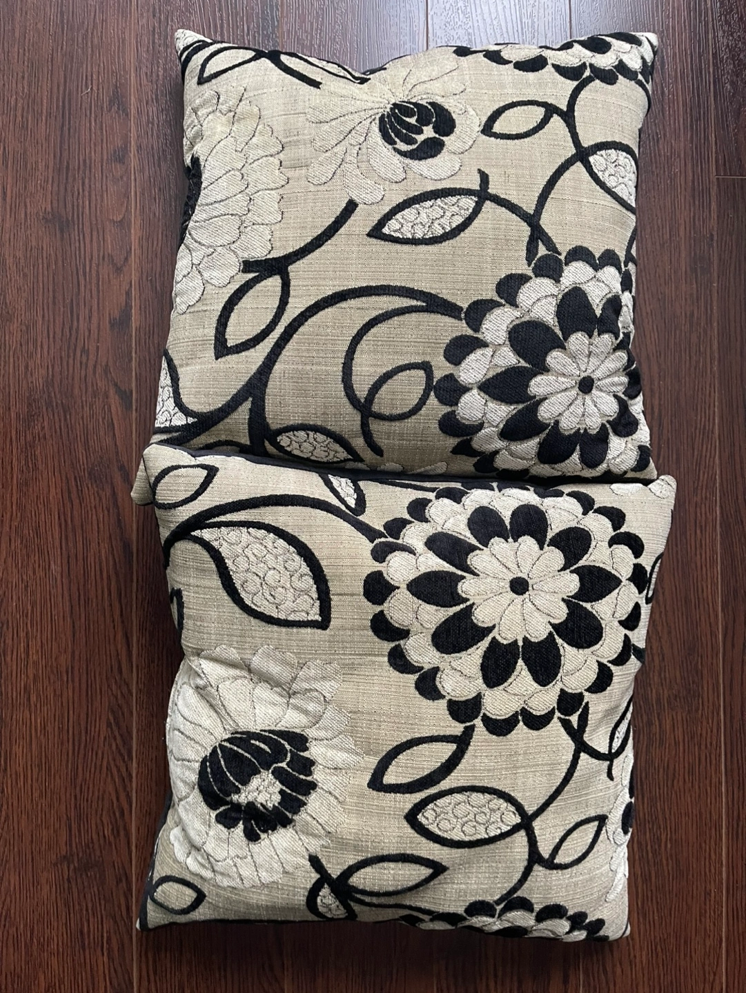 Set of two decorative throw pillows. Beige fabric with black embroidered floral pattern. Great for adding a touch of elegance to your living room or bedroom. Soft and comfortable. $3 each