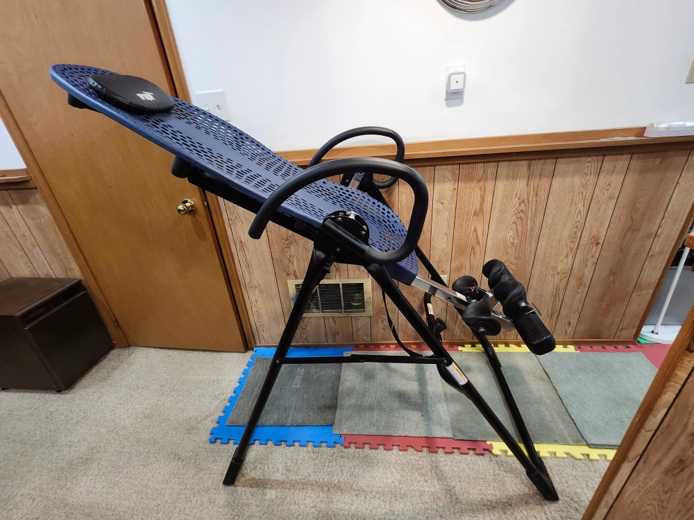 Used a few times before, but not anymore. Put to one side. Still in good condition. Blue and black. Adjustable. Features headrest and ankle supports.