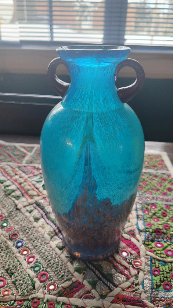 Beautiful teal blue art glass 2 handle vase