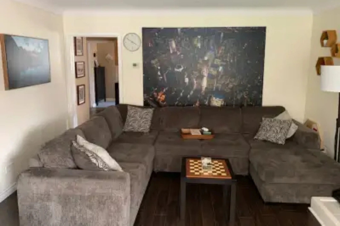 Large grey sectional sofa. Lots of seating. Includes several throw pillows. Good condition.