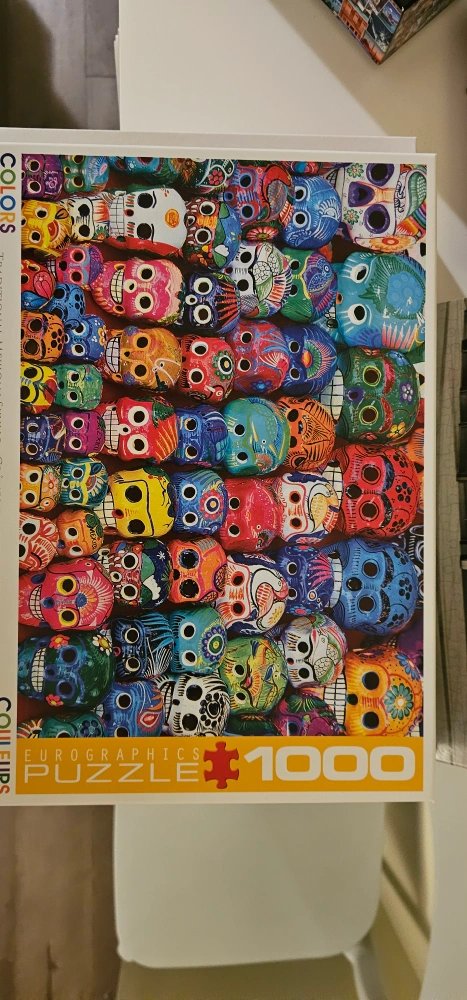 1000-piece jigsaw puzzle. Features colourful, decorated skulls. Used but in great condition, still in box.