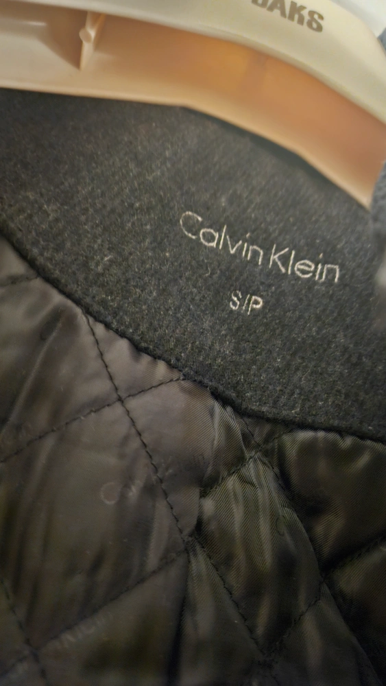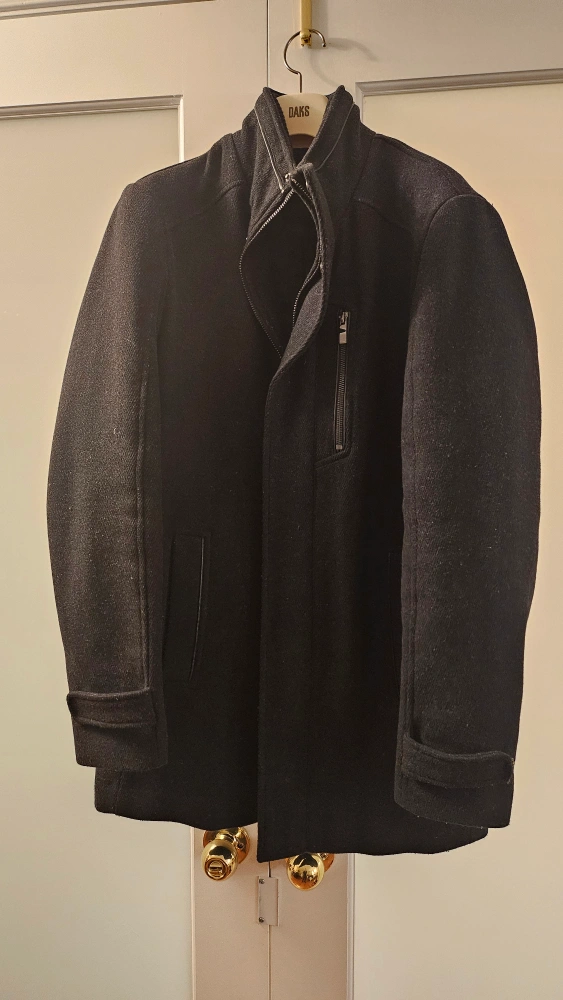 352Stylish black peacoat. Features a stand collar, zipper closure, and two zippered pockets.