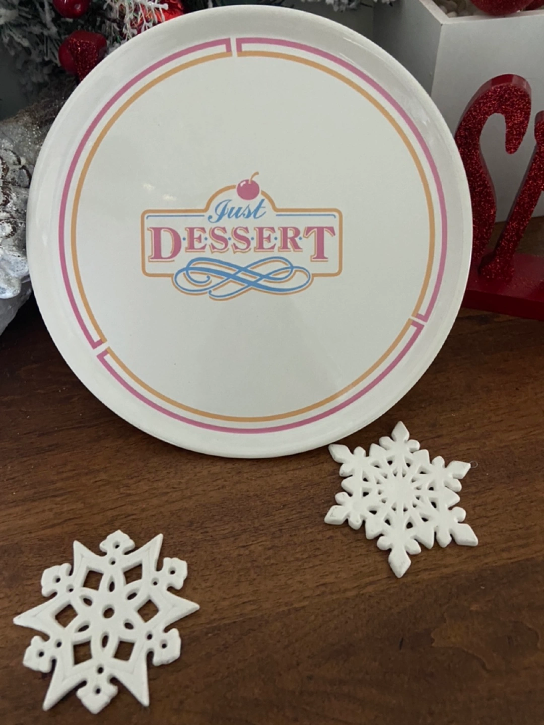 Adorable vintage cake stand. Features a "Just Dessert" design. Cream coloured with pink and blue accents. Perfect for serving desserts or as a decorative piece.