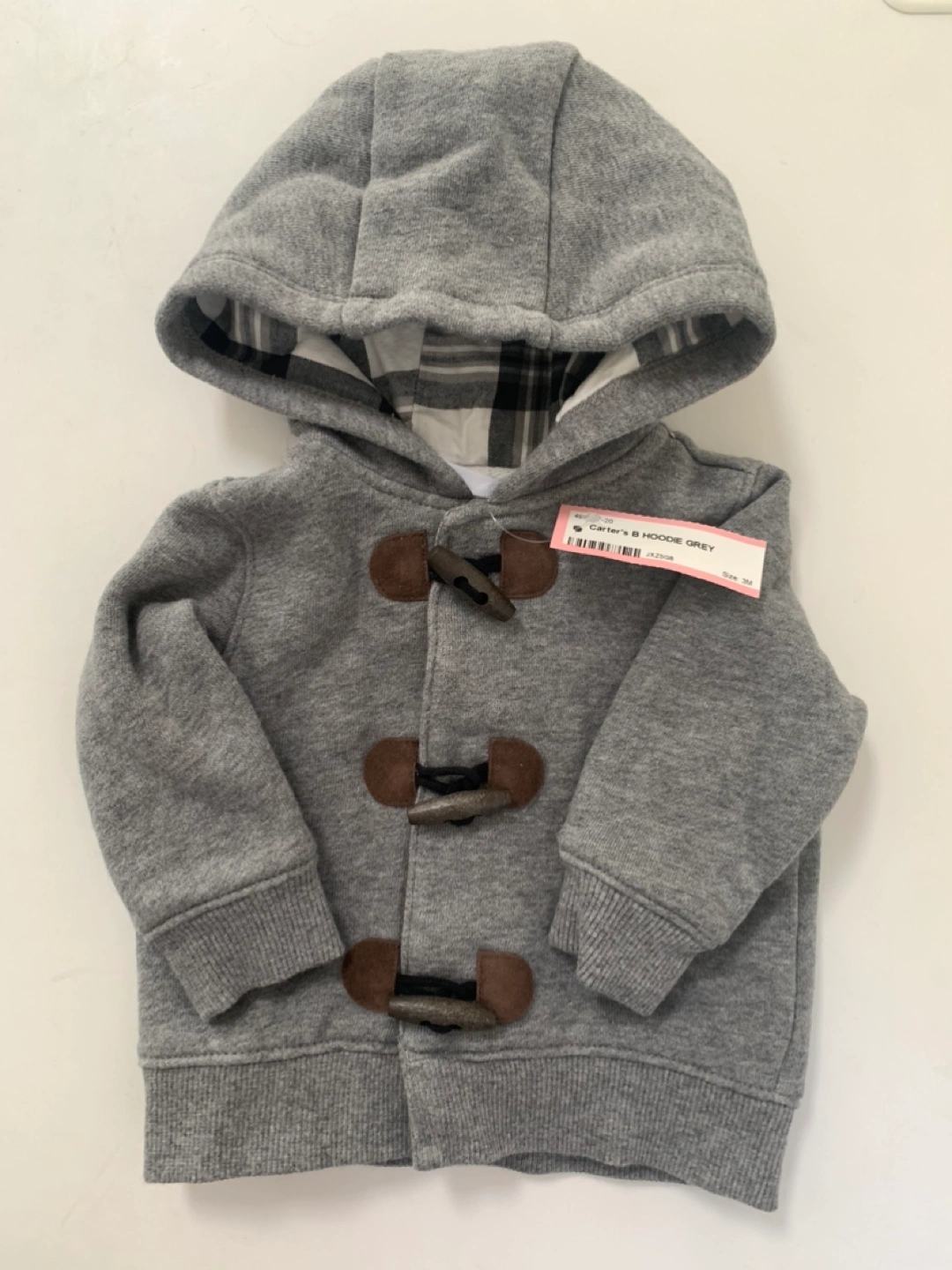 511Carters grey hoodie. Like new condition. Size says 3M but is bigger than usual for that size. Probably a conventional 3-6M if I had to guess.