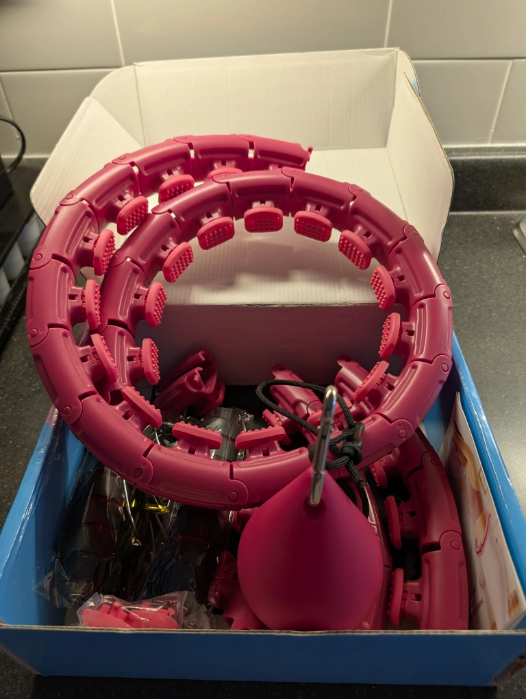 New in box, pink weighted hula hoop. Great for fitness and weight loss. Adjustable size. Includes extra pieces.