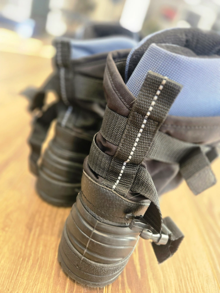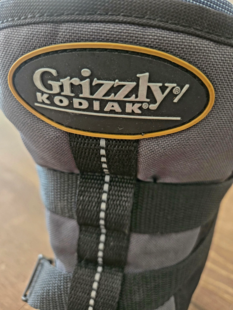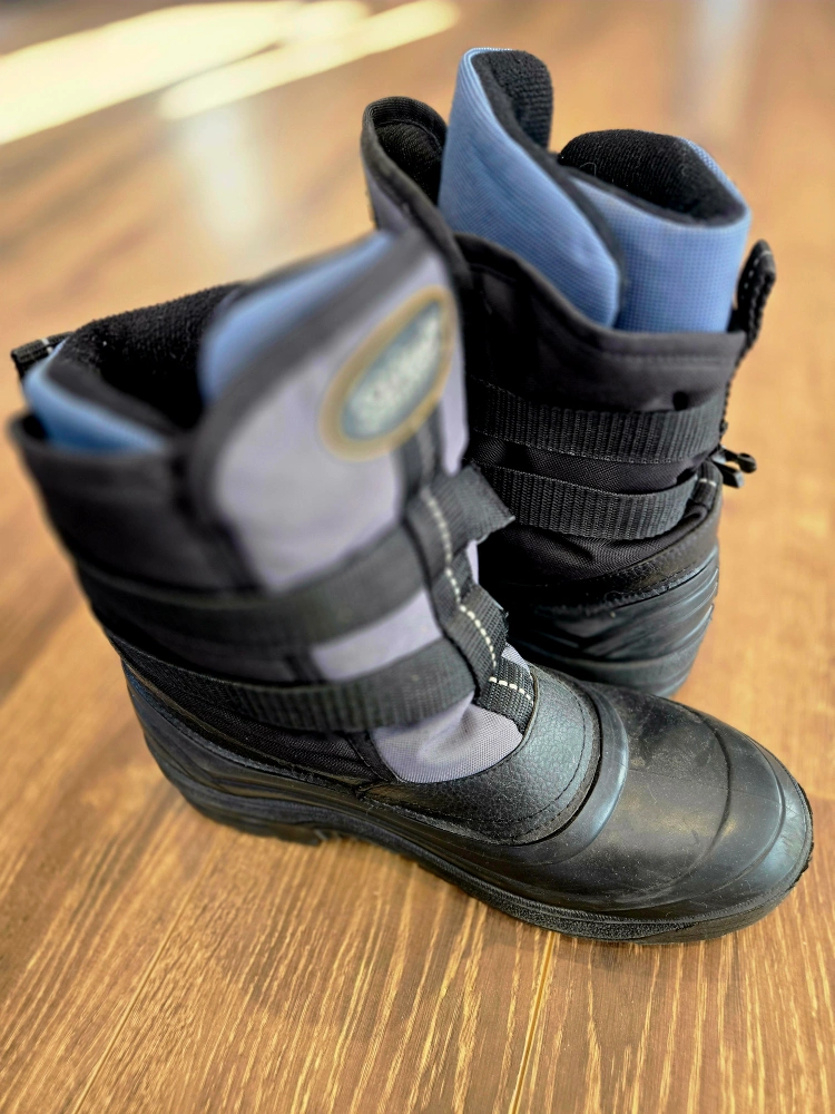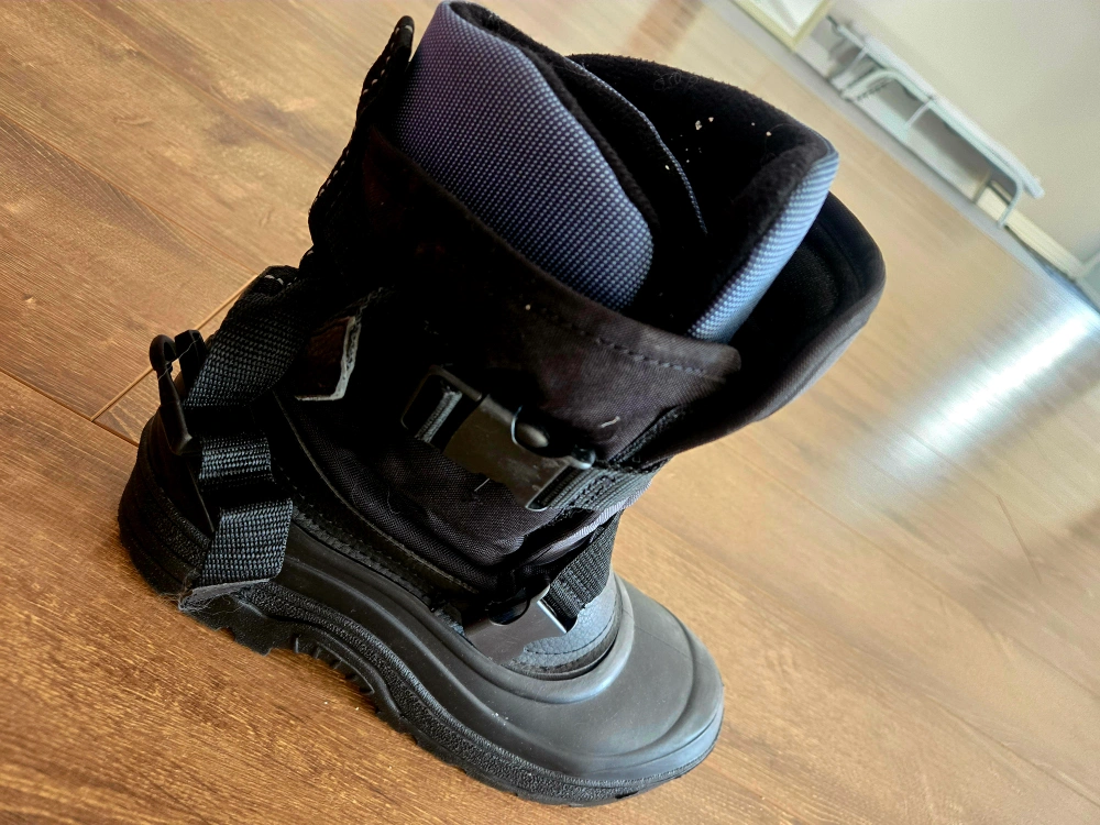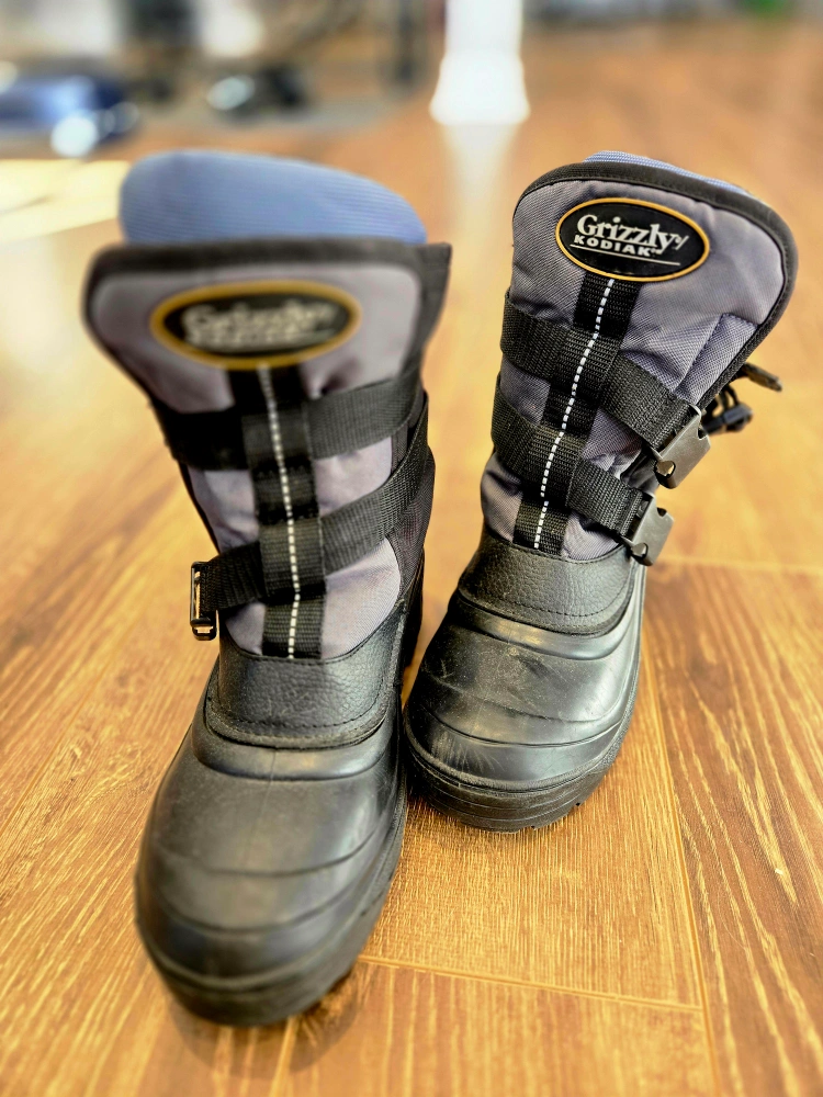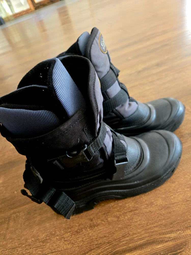 Men's winter boots. Grey and black color scheme. Waterproof rubber soles. Hook and loop closures. Good for snow and cold weather. Size 9