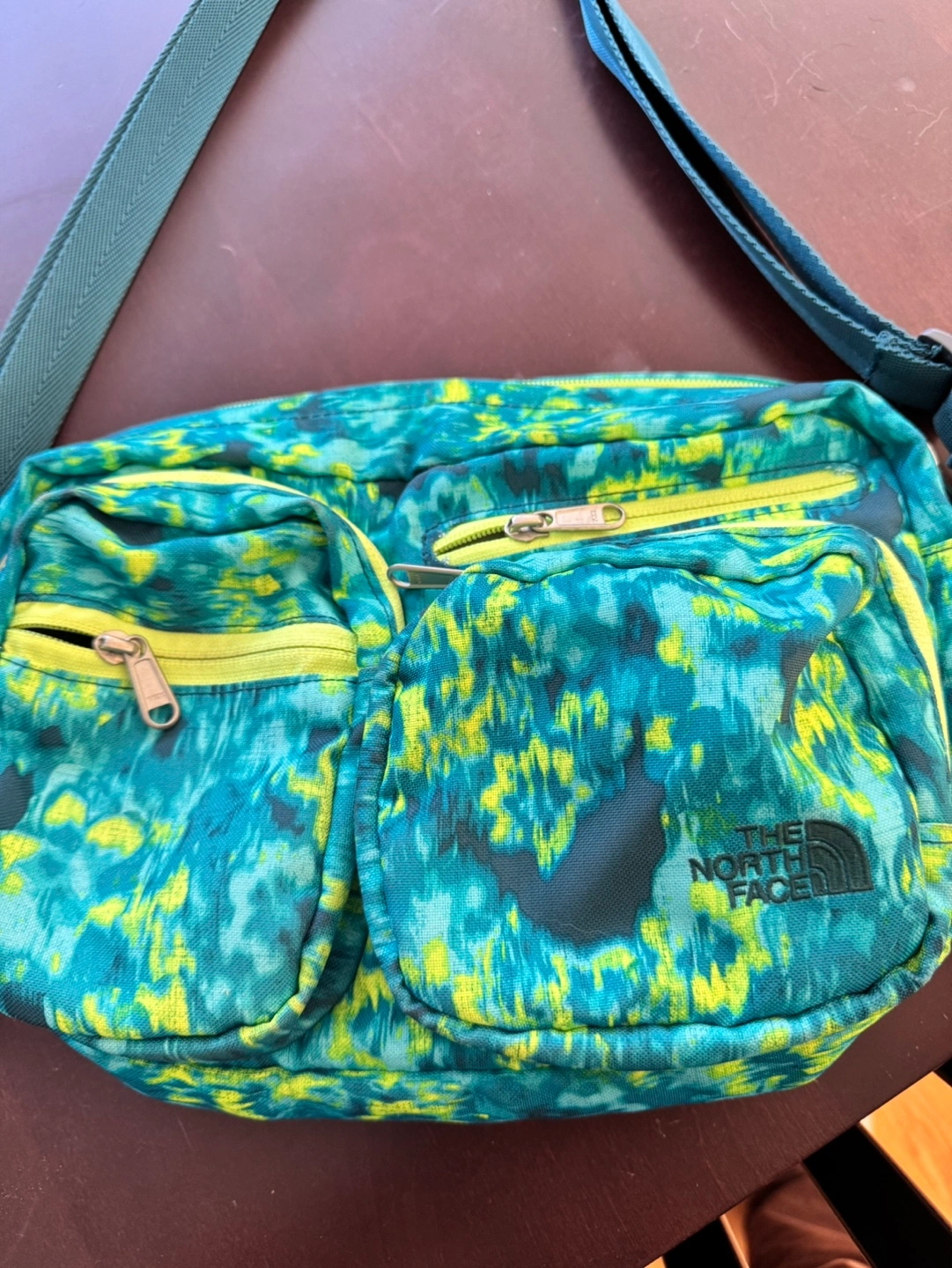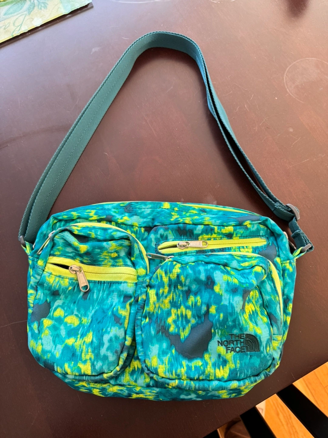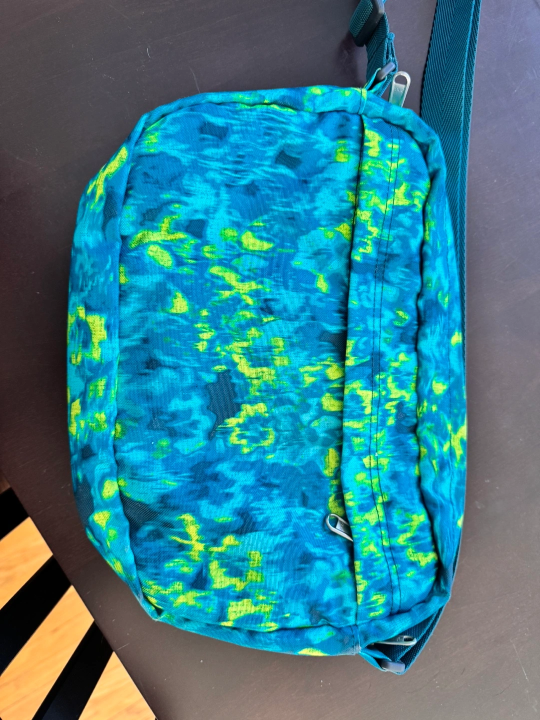 Small crossbody bag. Teal and lime green patterned fabric. Multiple zippered compartments. Adjustable shoulder strap.