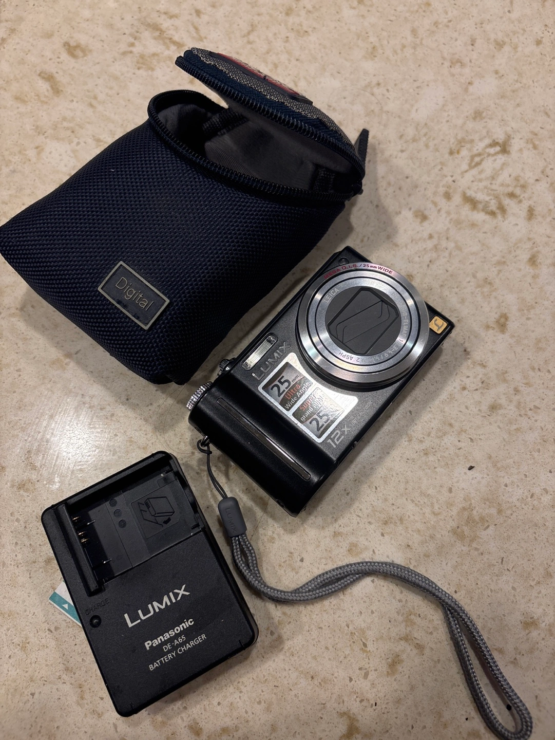 Compact digital camera. Includes charger and carrying case. 12x optical zoom.