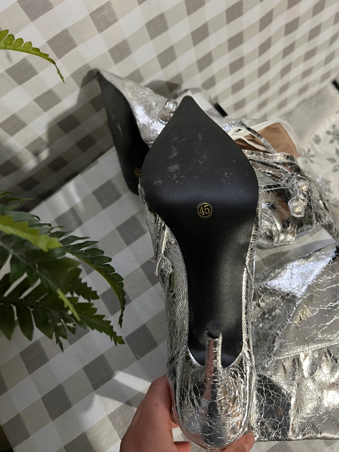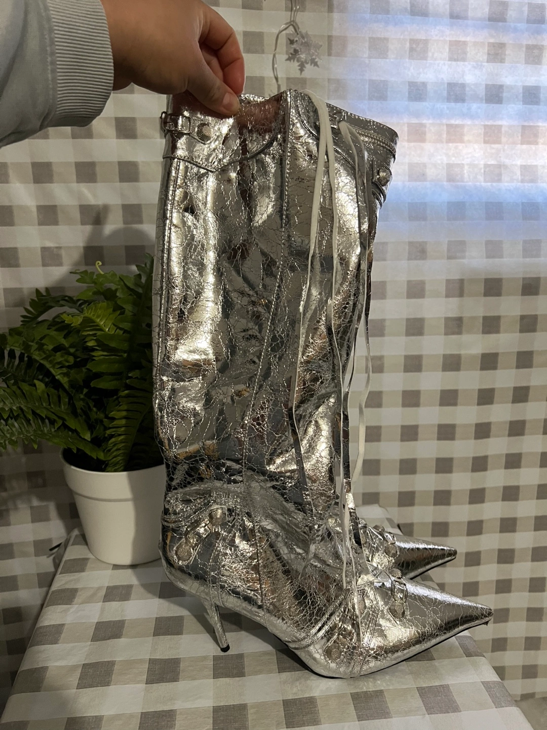Stunning silver metallic knee-high boots. Pointed-toe design. Features a stiletto heel and laces. Size 45.