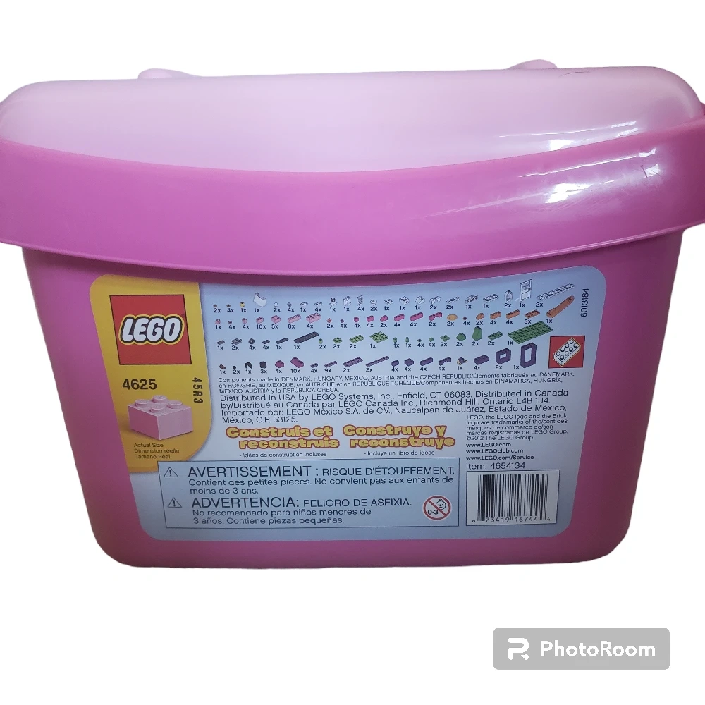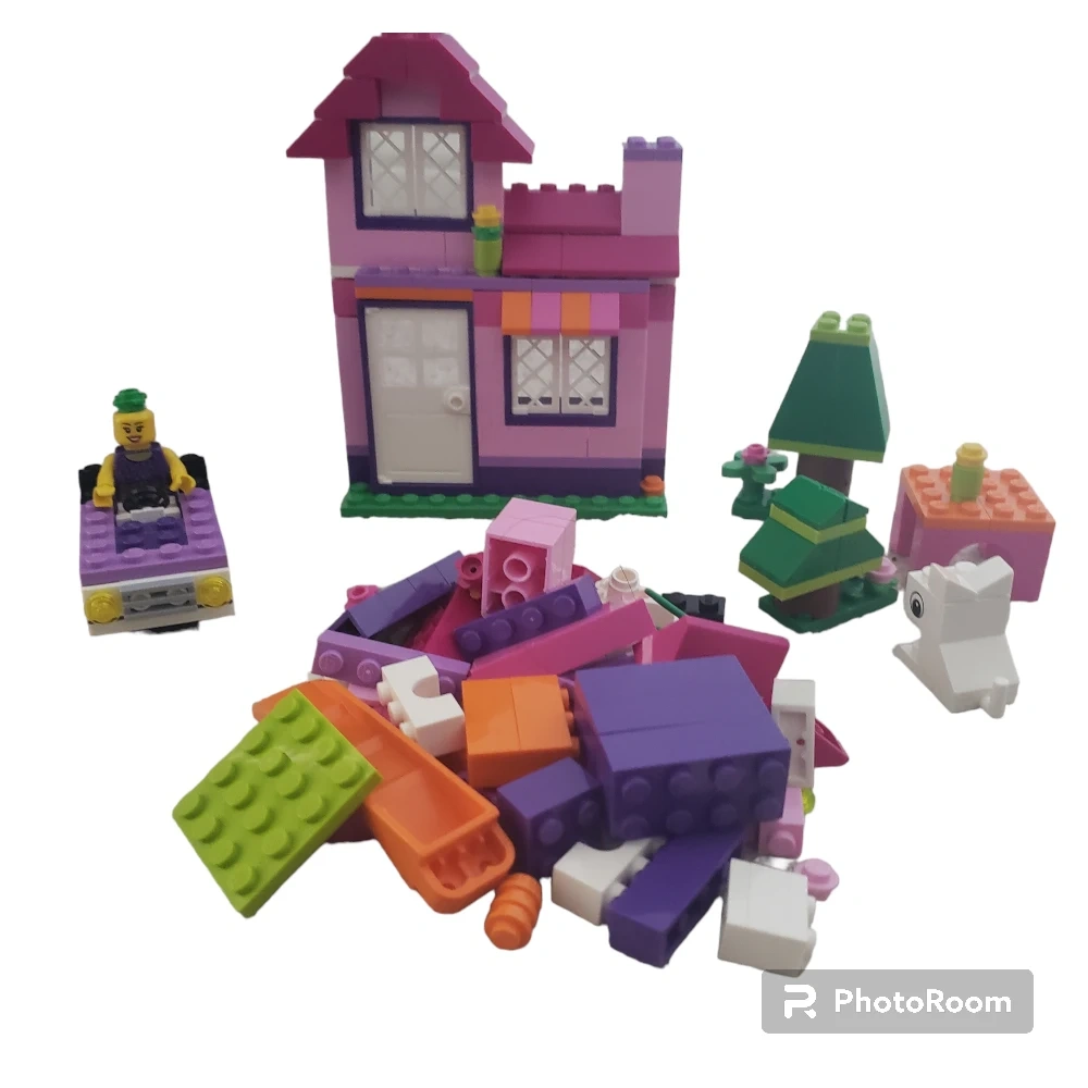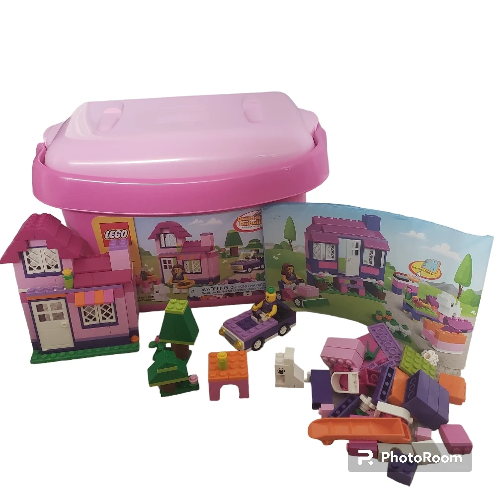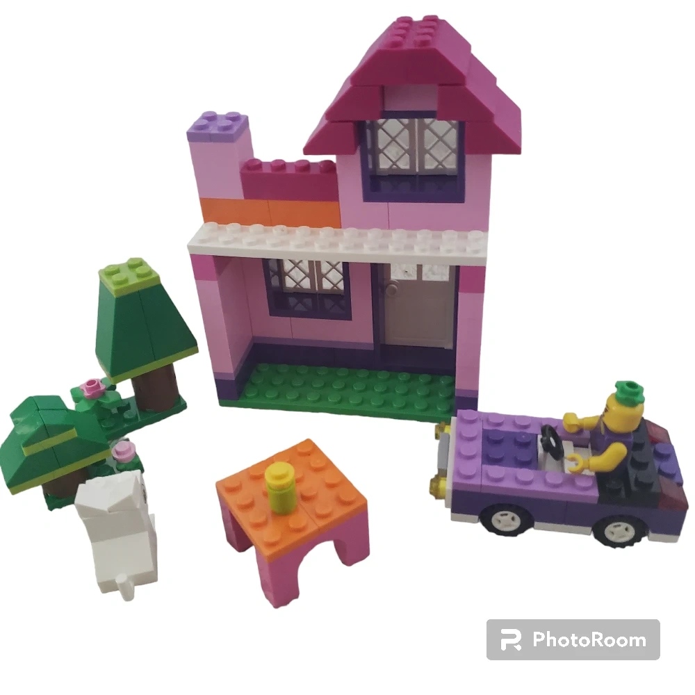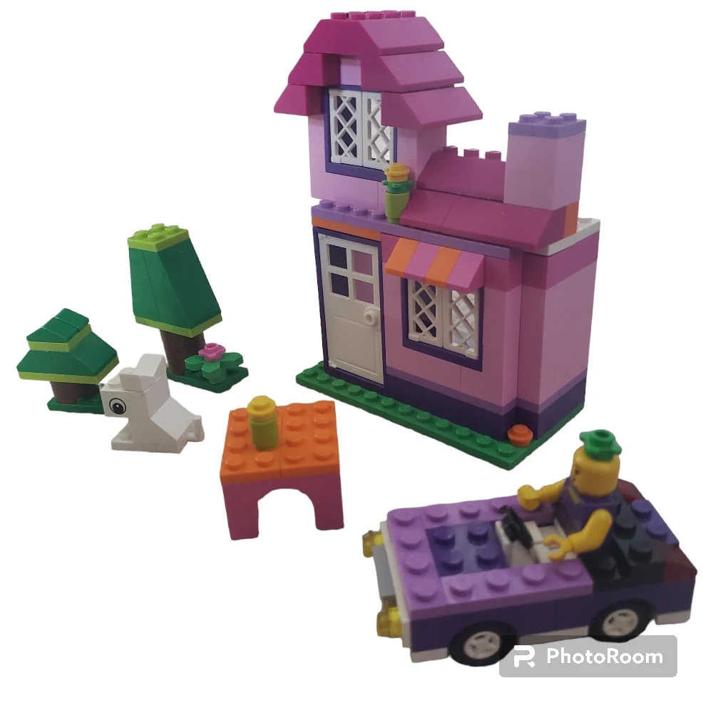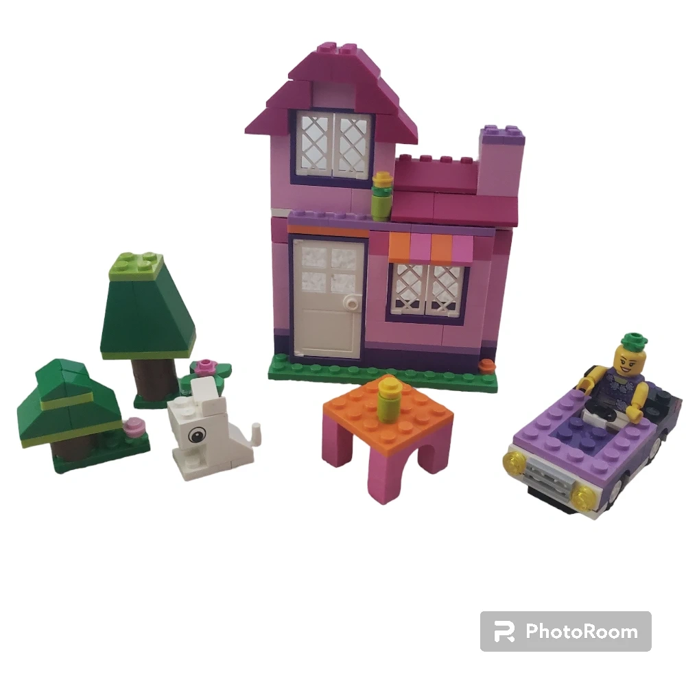 LEGO DUPLO 4625 set 200+ pieces. Features a pink house, purple car, minifigure, trees, and other accessories. Great for imaginative play.