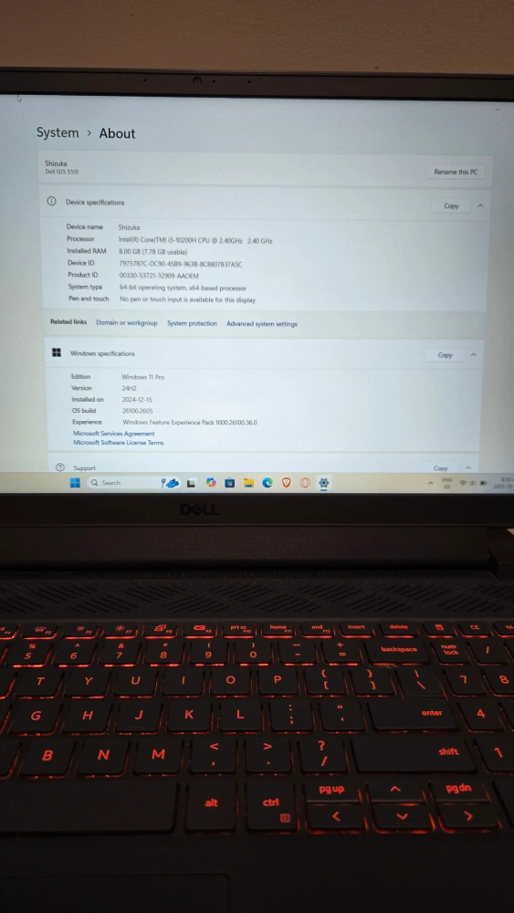 Used Dell G15 gaming laptop. Intel i5-10200H processor. 8GB RAM. Windows 11 Pro operating system. Backlit keyboard.